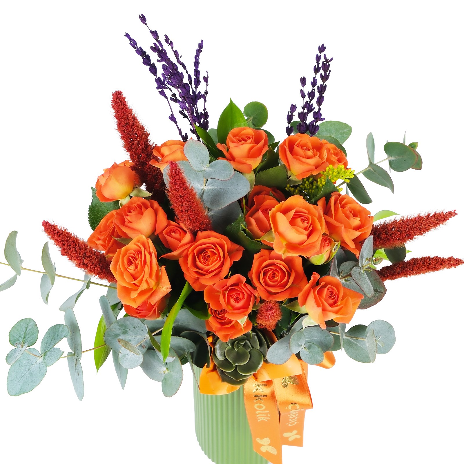 Çiçek Türleri:Turuncu güller,kuru çiçekler, okaliptus