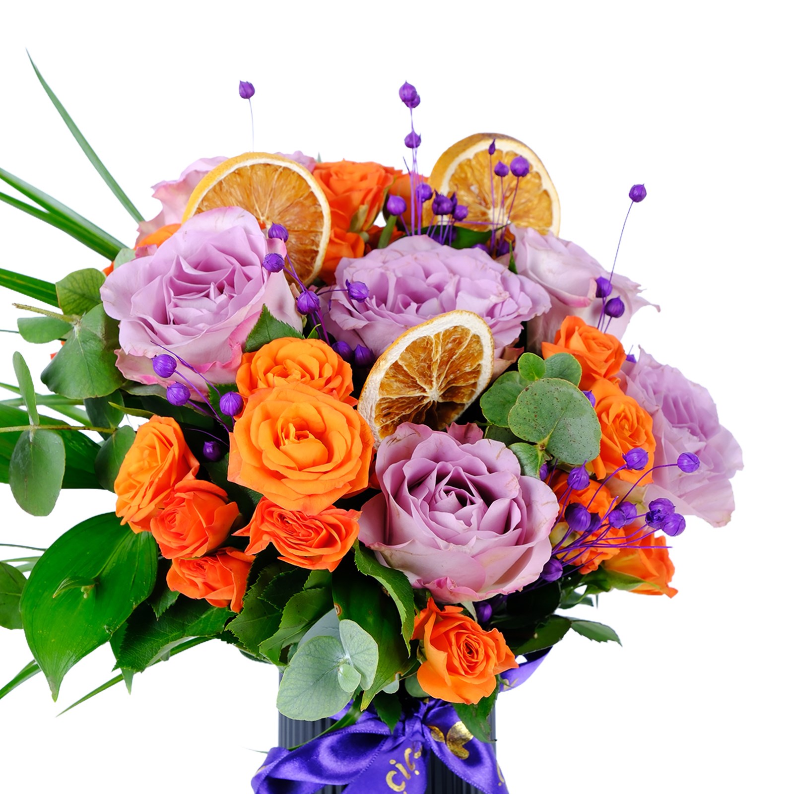 Enerjisi yüksek renklerin buluştuğu Turuncu Lila Çiçek Aranjmanı, modern ve ferah bir görünüm sunar. Turuncu güller, lila güller ve kuru çiçek dalları zarif bir kompozisyon oluşturur.