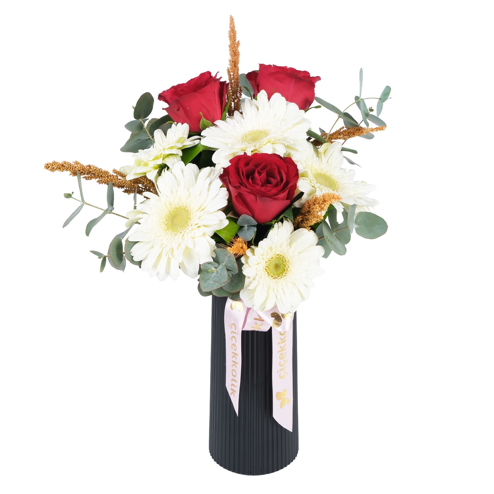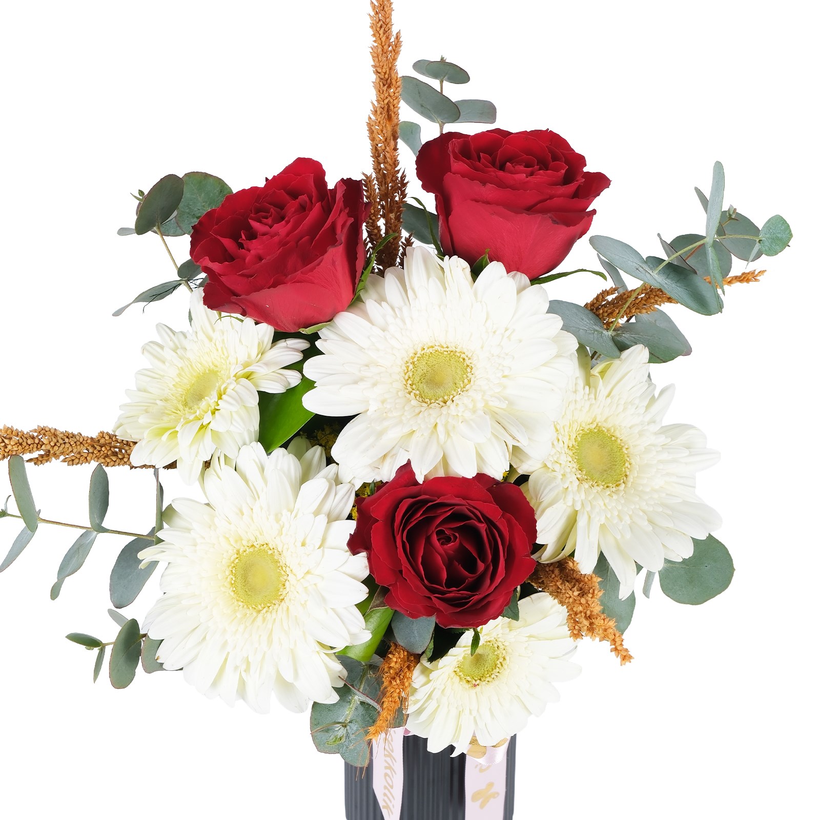 • Kırmızı gerbera, güller ve kuru çiçek karışımı
