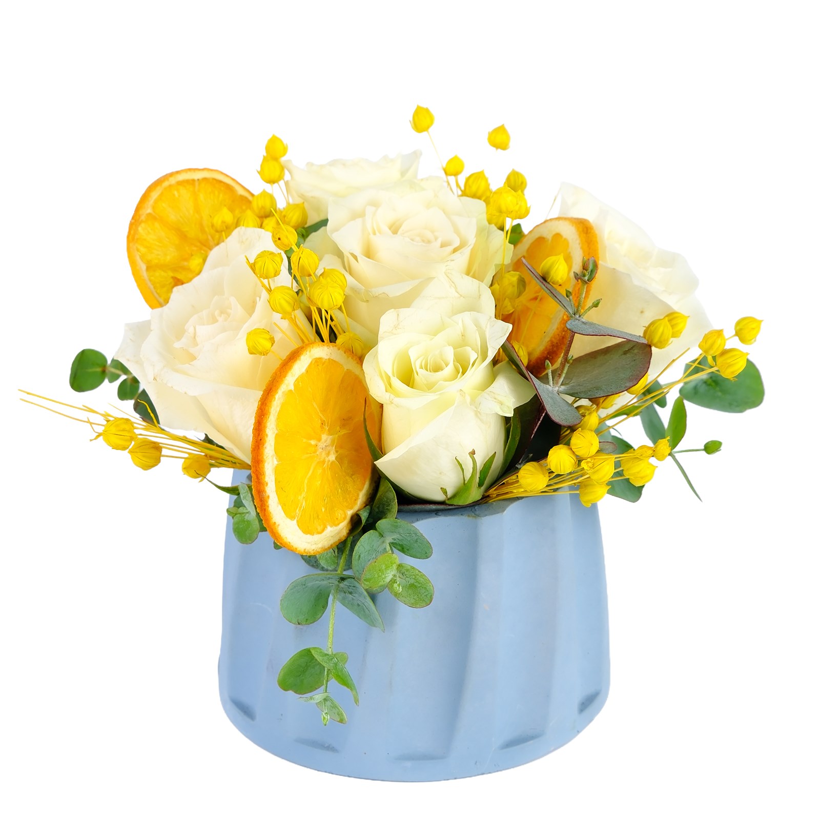 Romantik Beyaz güllerin narinliği ve masumiyeti bu aranjmanda iç ısıtan bir uyumla birleşiyor. Kurutulmuş portakal dilimi ve okalitus detayları tasarıma modern ve sıcak bir hava katıyor. Neşeyi ve sevgiyi zarif bir şekilde ifade etmek için harika bir seçimdir.