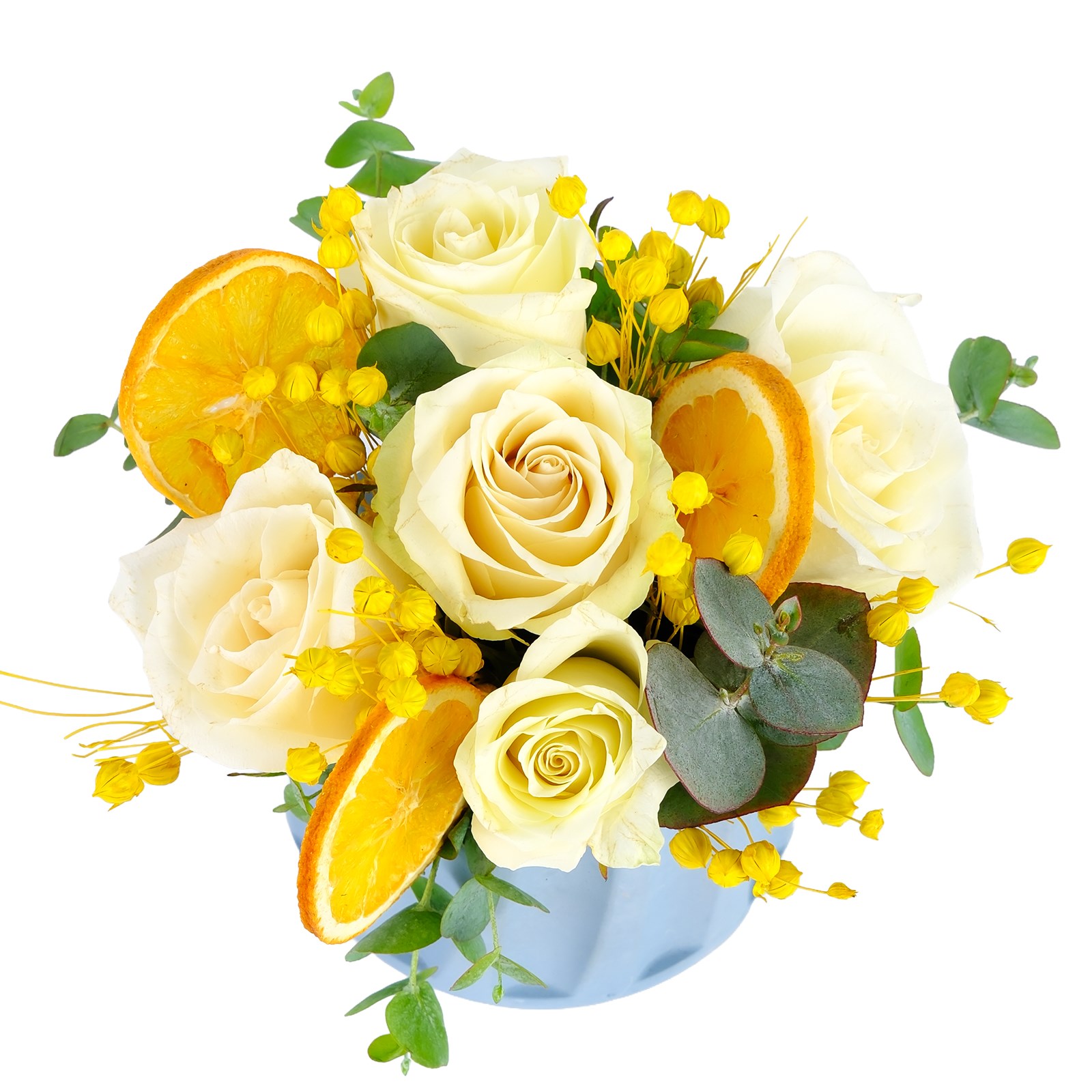 Ürün İçeriği:Beyaz güller, kurutulmuş portakal dilimi,okaliptus