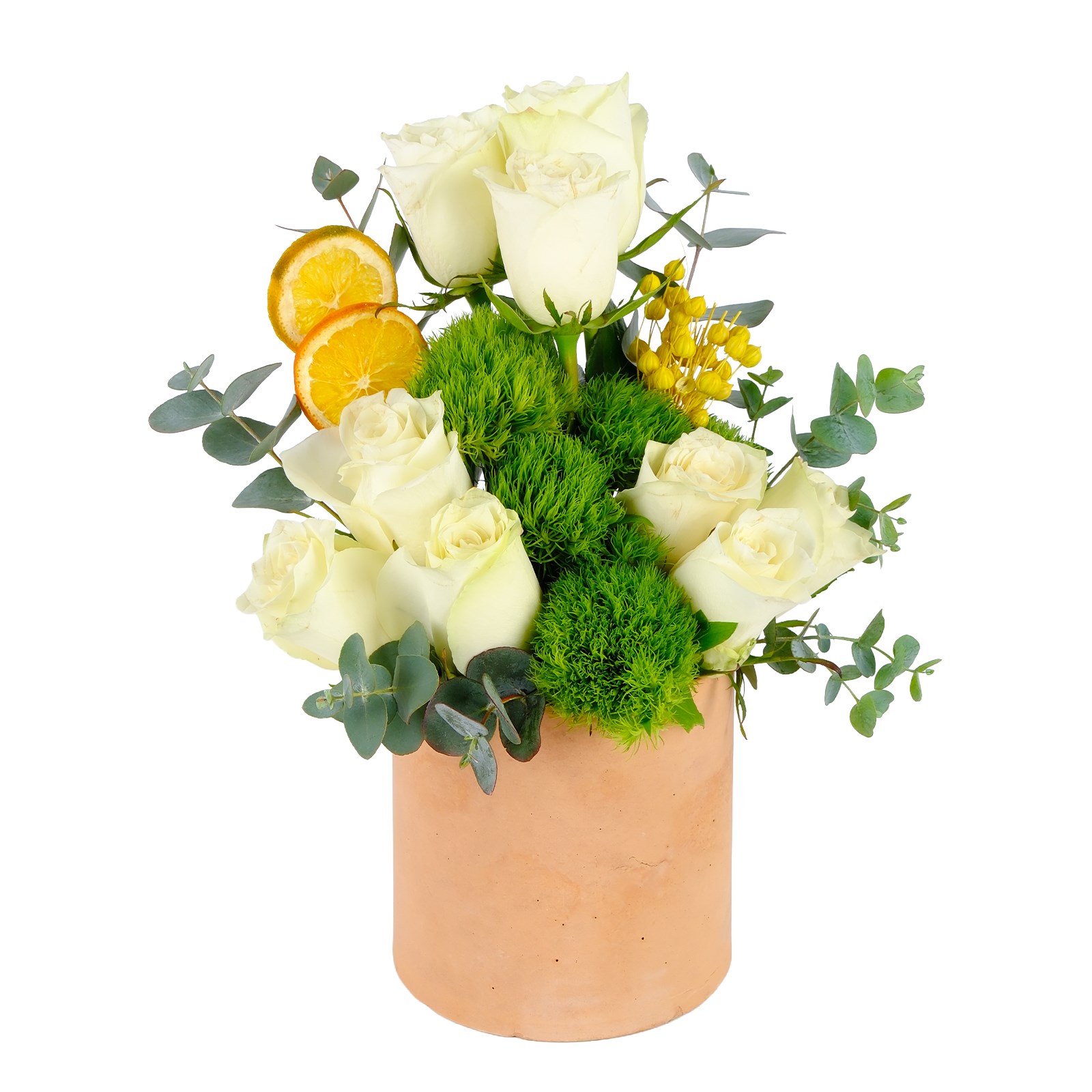 Enerjisi yüksek renklerin buluştuğu Brown & White Güller, modern ve ferah bir görünüm sunar. Beyaz güller ve kuru çiçek dalları zarif bir kompozisyon oluşturur.