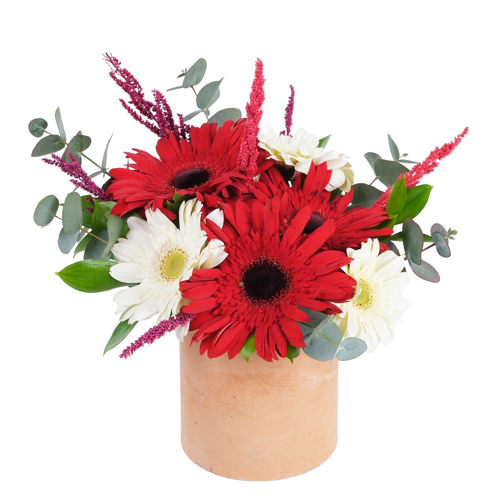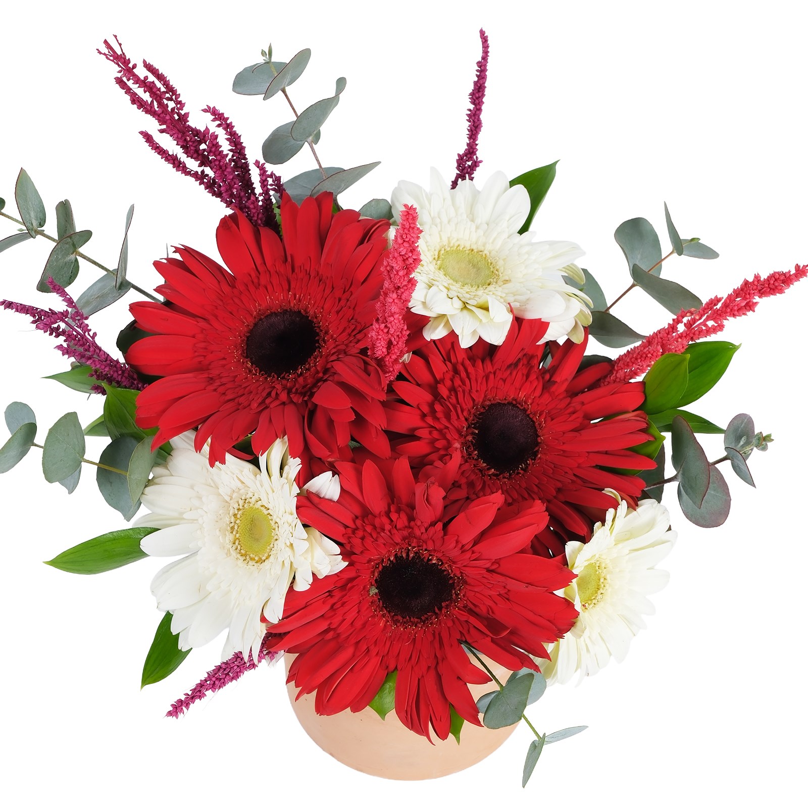 • Beyaz, kırmızı gerbera ve kuru çiçek karışımı