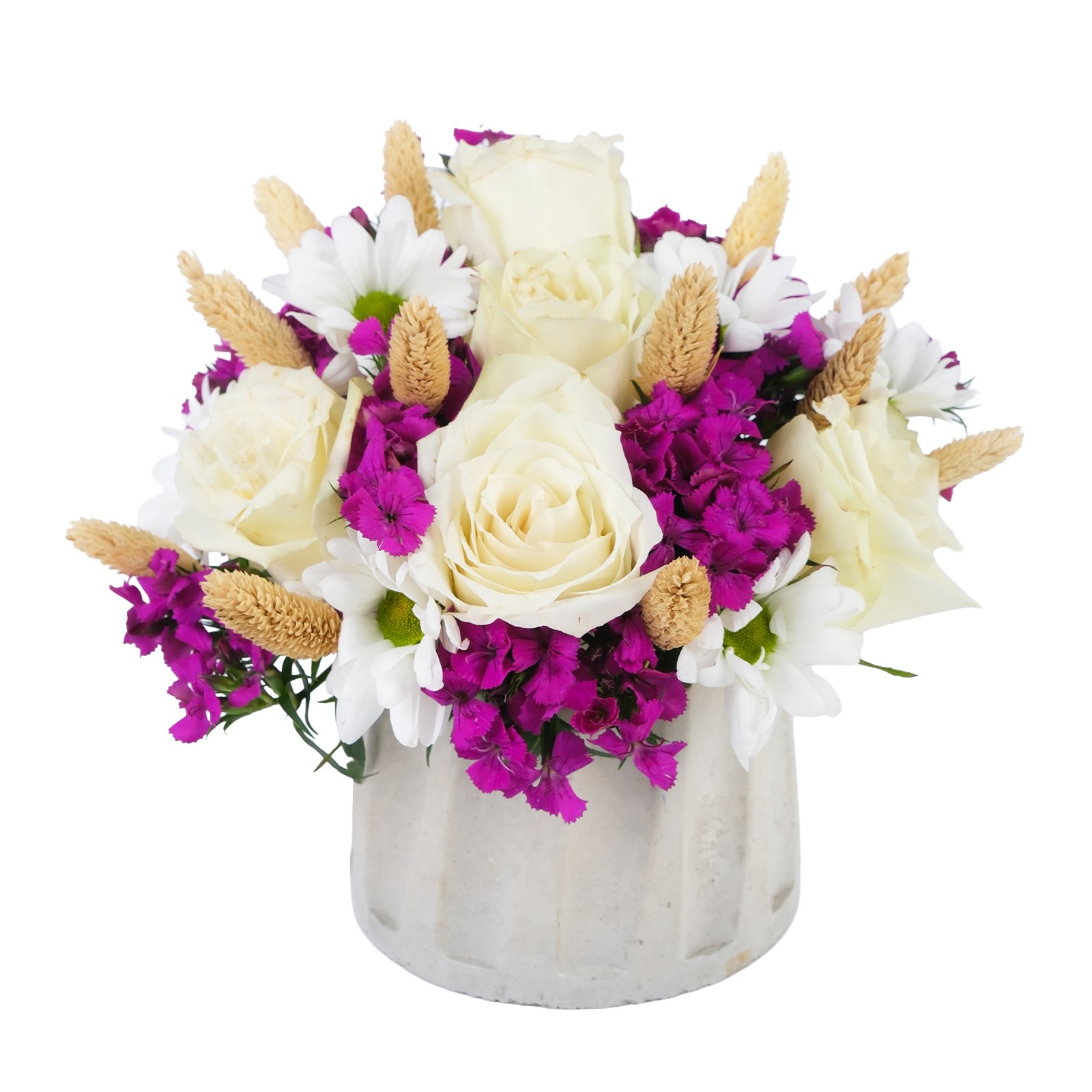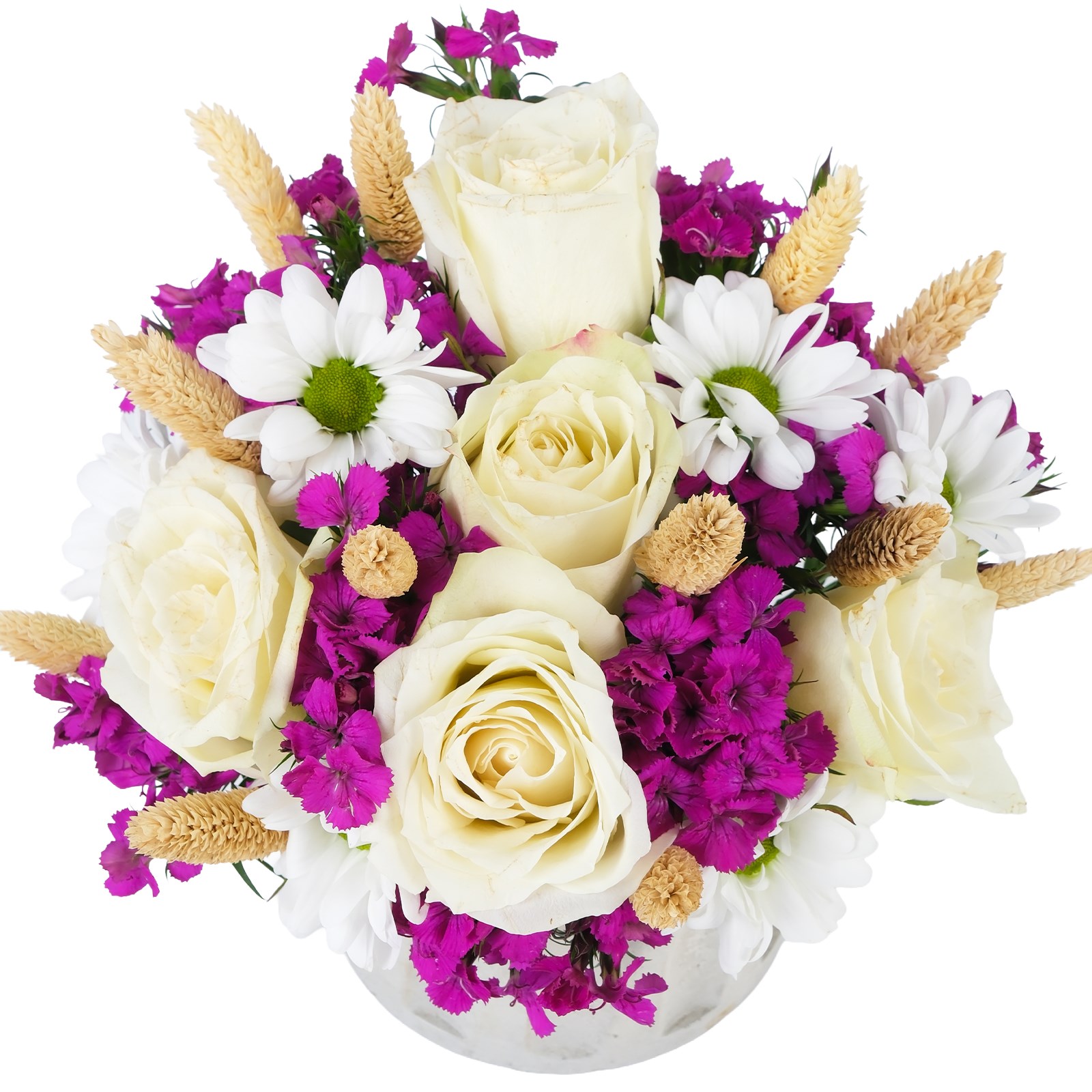 Romantik beyaz güllerin narinliği ve beyaz papatyaların masumiyeti bu aranjmanda iç ısıtan bir uyumla birleşiyor. Kuru çiçek detayları tasarıma modern ve sıcak bir hava katıyor. Neşeyi ve sevgiyi zarif bir şekilde ifade etmek için harika bir seçimdir.