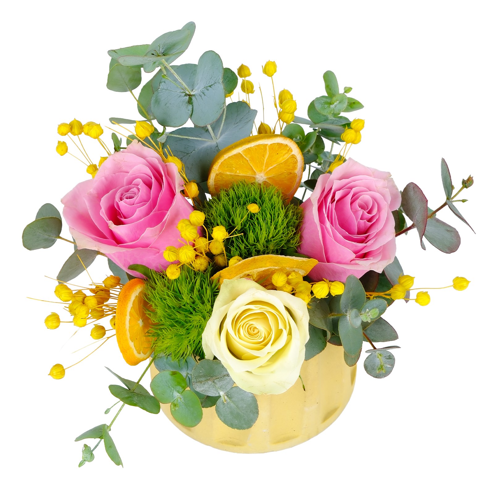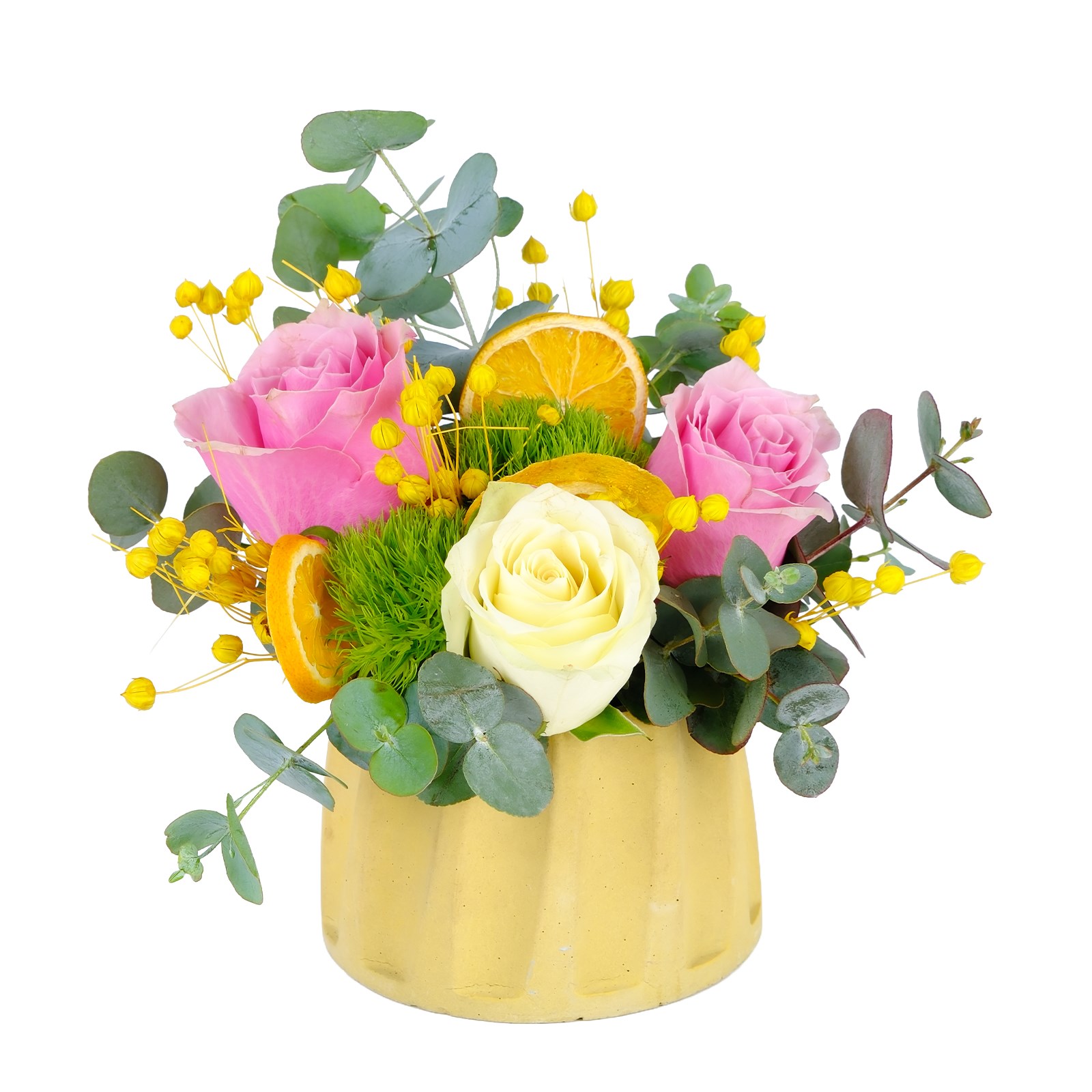 Enerjisi yüksek renklerin buluştuğu Colorful Güller, modern ve ferah bir görünüm sunar. Beyaz,pembe güller ve kuru çiçek dalları zarif bir kompozisyon oluşturur.