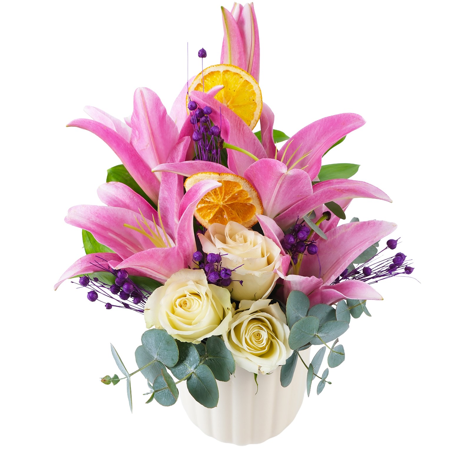 Beyaz güller ve lilyum romantizmi Cream Serenity Gül & Lilyum, aşkın en tutkulu halini yansıtıyor. Modern tasarım sofistike kontrastı, çarpıcı bir görsel sunarken okaliptus yaprakları kuru çiçekleriyle eşsiz bir dokunuş kazanılmıştır.