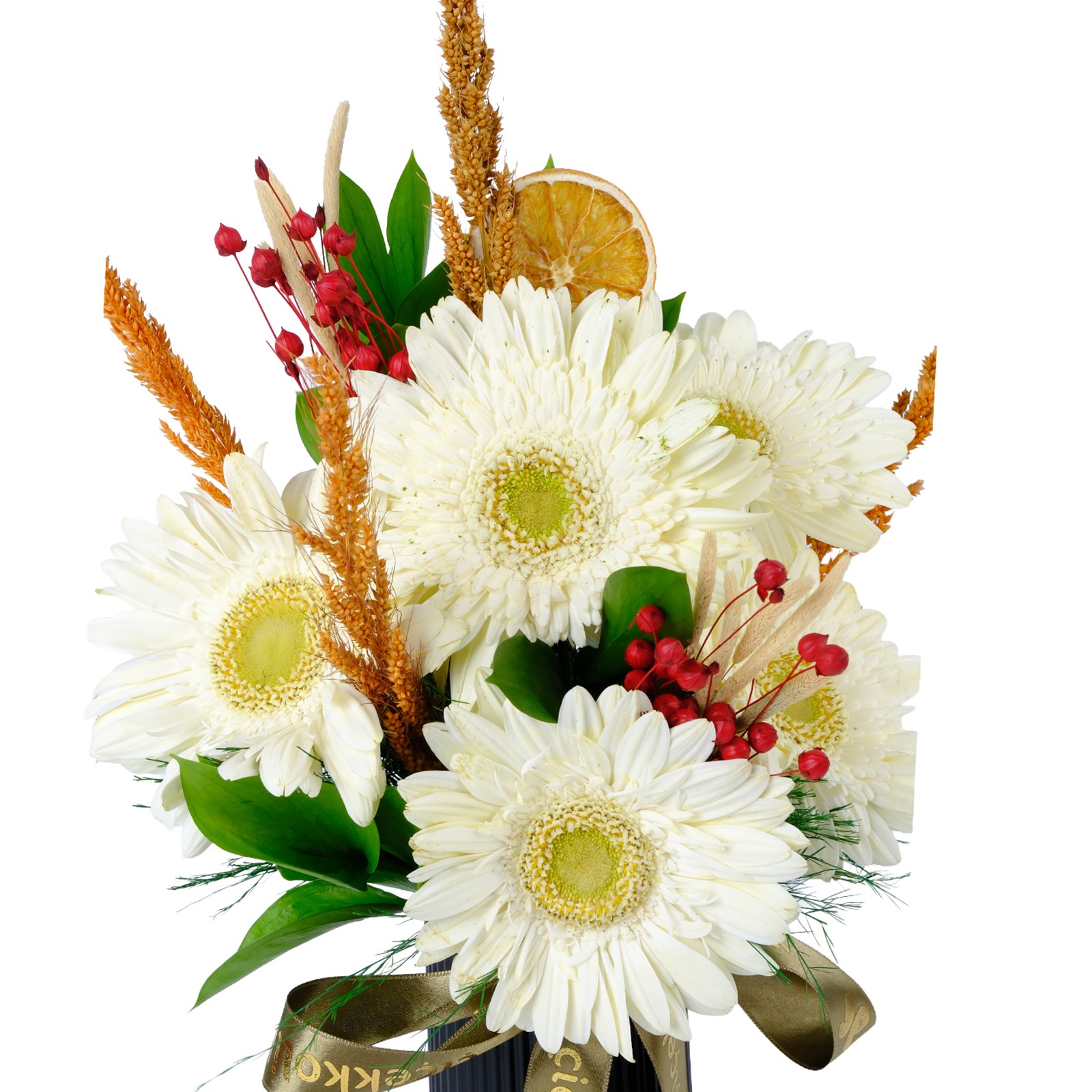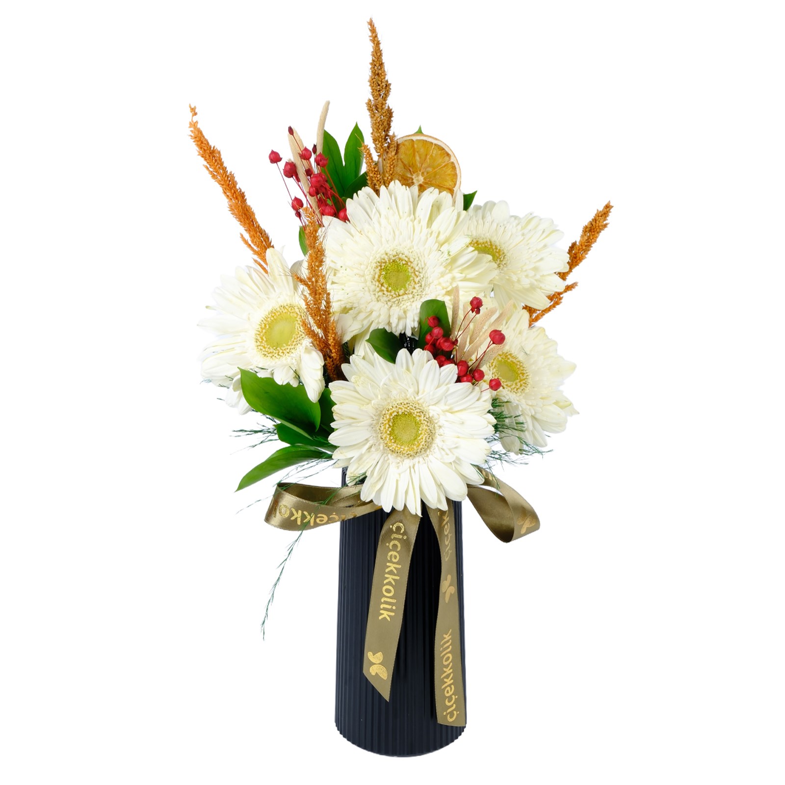 Zarif ve sade bir görünüm sunan bu Crimson Light Beyaz Gerbera Vazosu, modern siyah vazo ile şık bir kontrast oluşturur. Tropik yeşilliklerin doğal kokusu ve gerberaların tazeliğiyle ev ve ofis dekoruna hafiflik katar.