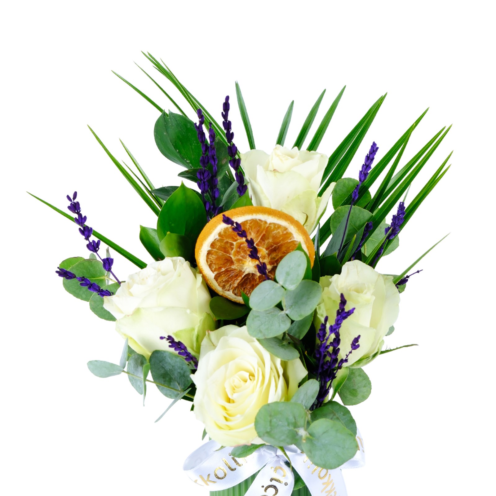 Enerjisi yüksek renklerin buluştuğu Crystal white 4 beyaz gül Aranjmanı, modern ve ferah bir görünüm sunar. beyaz güller, okaliptus dalları ve kuru çiçek dalları zarif bir kompozisyon oluşturur.