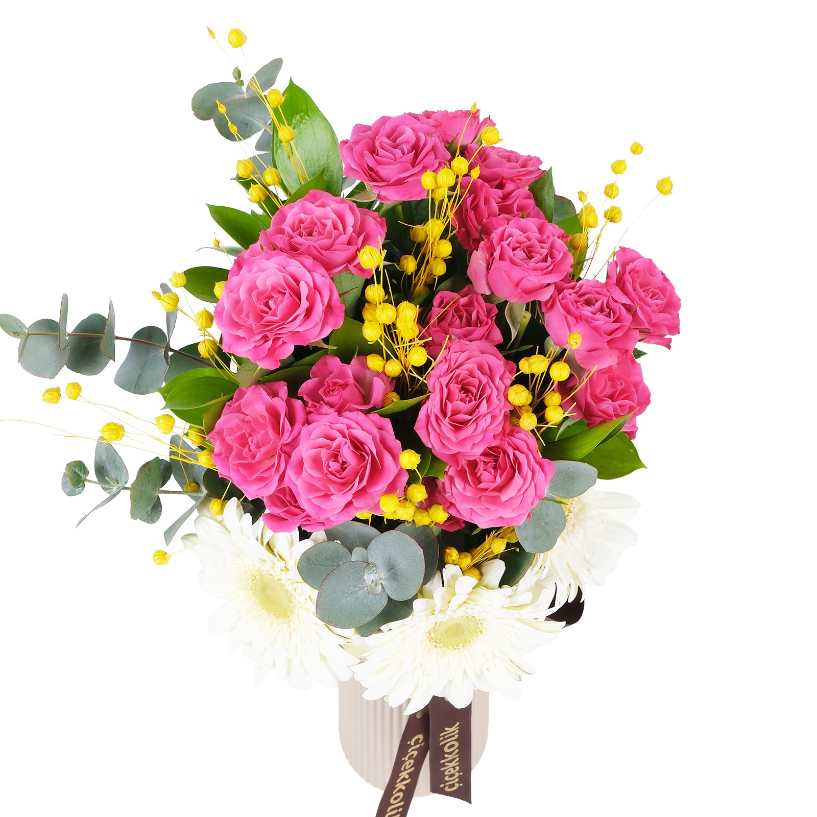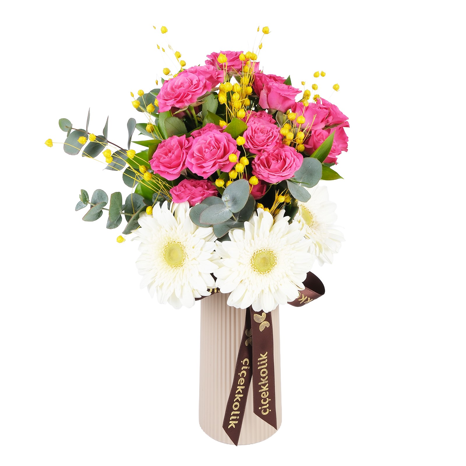 Pembe güllerin romantizmi Dazzling Pembe Çardak Güller, aşkın en tutkulu halini yansıtıyor. Bej polimer vazoda tasarım sofistike kontrastı, çarpıcı bir görsel sunarken okaliptus yaprakları ve kuru çiçekleriyle eşsiz bir dokunuş kazanılmıştır.