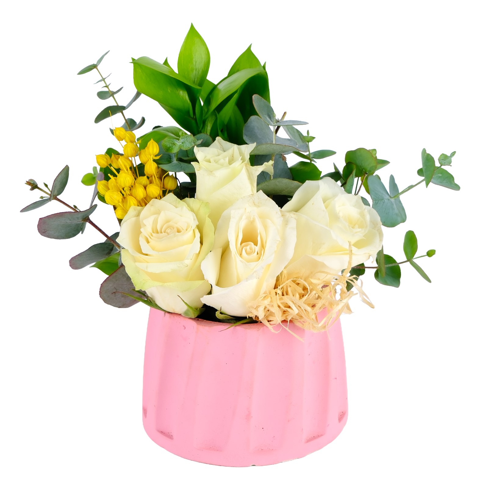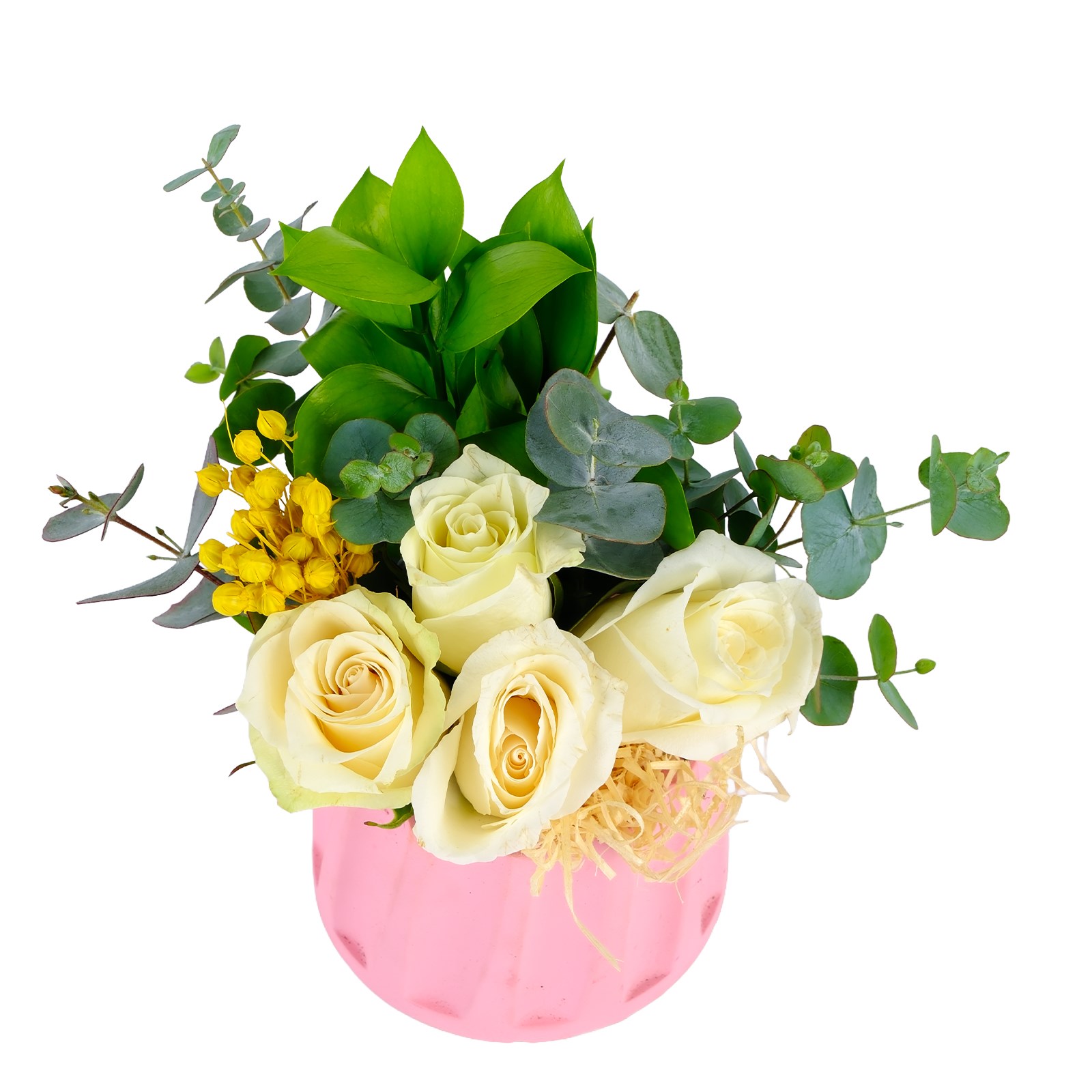 Romantik Beyaz güllerin narinliği ve masumiyeti bu aranjmanda iç ısıtan bir uyumla birleşiyor. Kuru çiçekler ve okalitus detayları tasarıma modern ve sıcak bir hava katıyor. Neşeyi ve sevgiyi zarif bir şekilde ifade etmek için harika bir seçimdir.