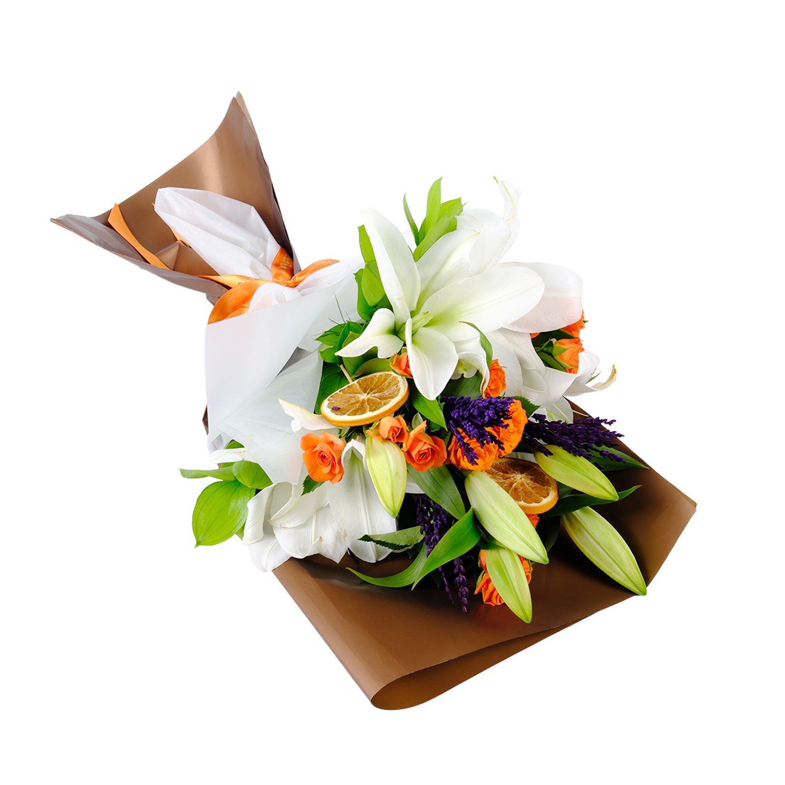 Turuncu Gül ve Beyaz Lilyum'un suya temas eden kısımlarını her gün tazeleyin. Daha fazla bilgi için Çiçek bakım rehberi sayfasına göz atabilirsiniz.