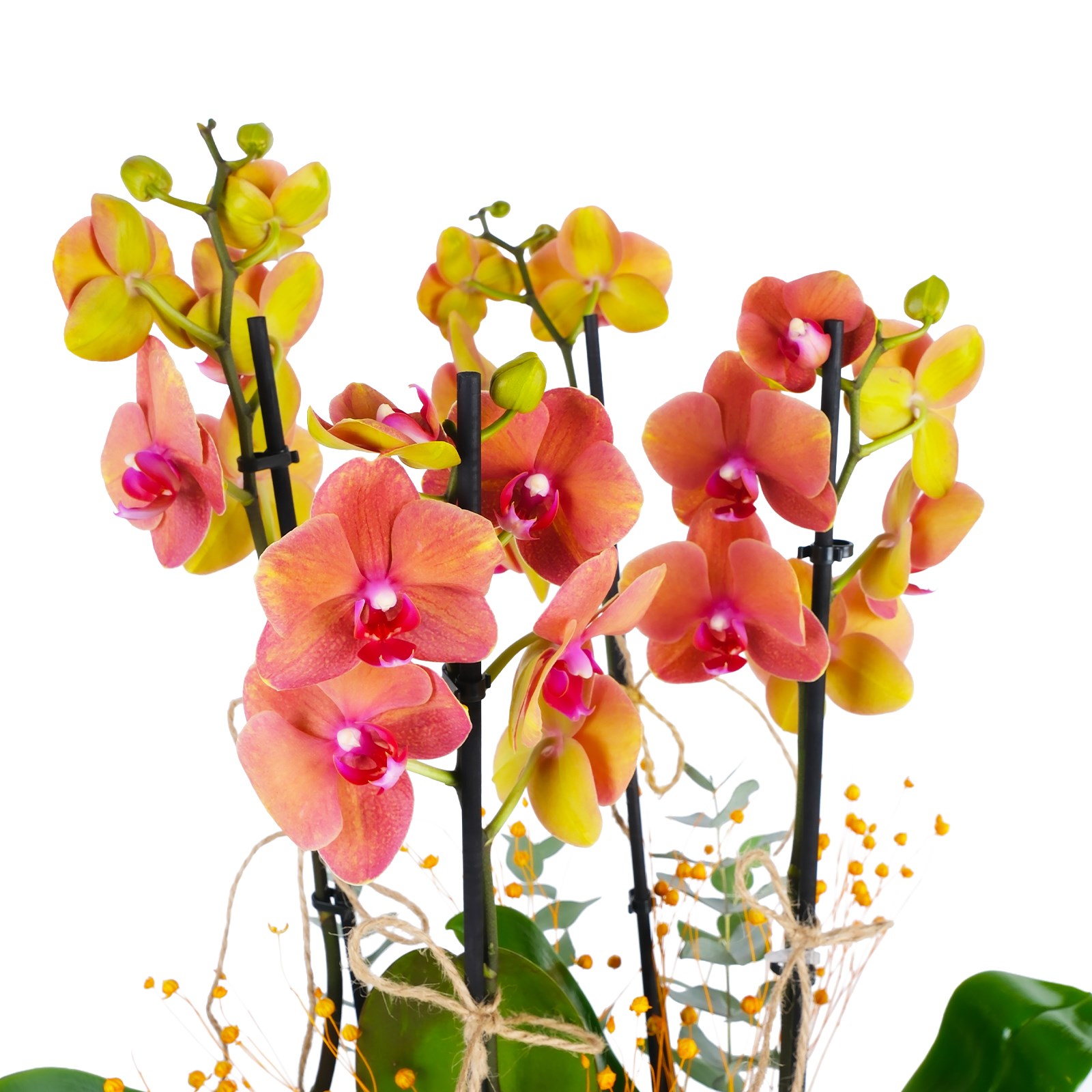 Saflığın ve zarafetin sembolü ateş orkide, doğal dekoratif saksı içerisinde yeşil yapraklar, okaliptus dalları ve yeşil yosunlar ile zenginleştirilerek hazırlanmıştır. Hem ev hem ofis ortamına şıklık katan bu özel aranjman, sevdiklerinize kalıcı bir mutluluk armağan eder.
