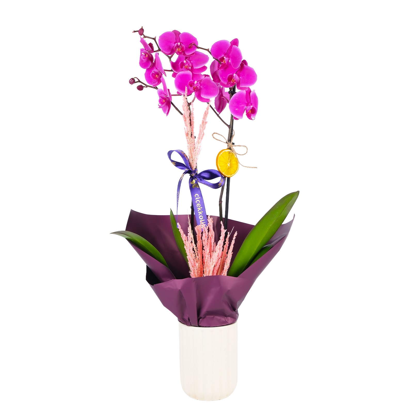Zarif görünümü ve eşsiz rengiyle Fold Purple Orkide, yaşam alanlarına modern bir dokunuş kazandırır. Dekoratif Seramik Saksısı ve mor kurdele detayıyla hem sofistike hem de dikkat çekici bir tasarım sunar.