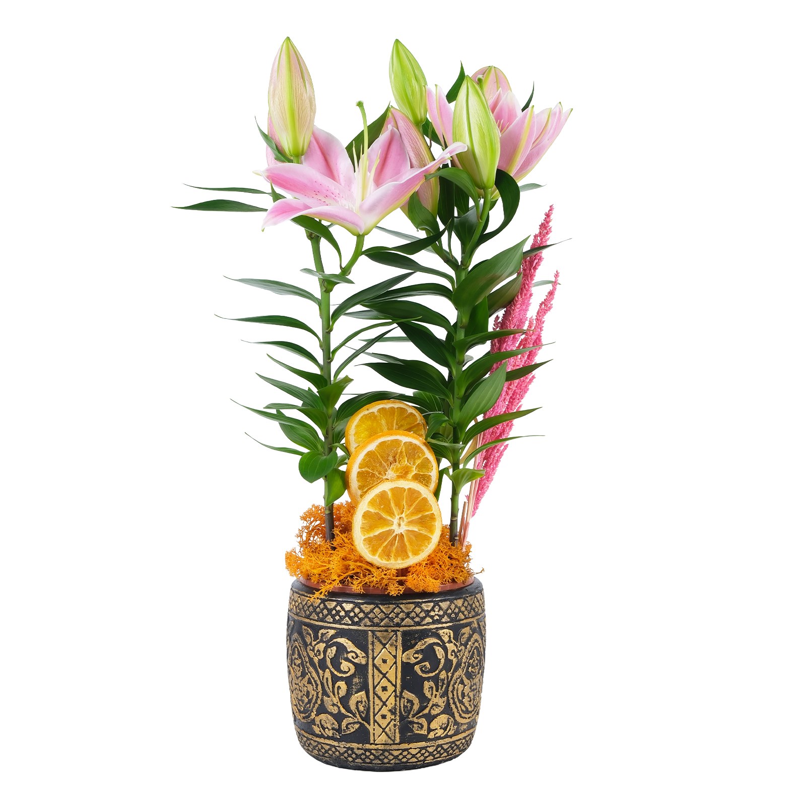 Gold Black Saksıda Lilyum Çiçeği, Floral designers ekibimizin özenle tasarladığı, neşeli ve sade bir saksı çiçeğidir. Bu şık saksı bitkisi, evinize zarif bir dokunuş katarken hoş bir kokuda sunar.Tedarik kaynaklı tomurcuk olarak gönderilmektedir.