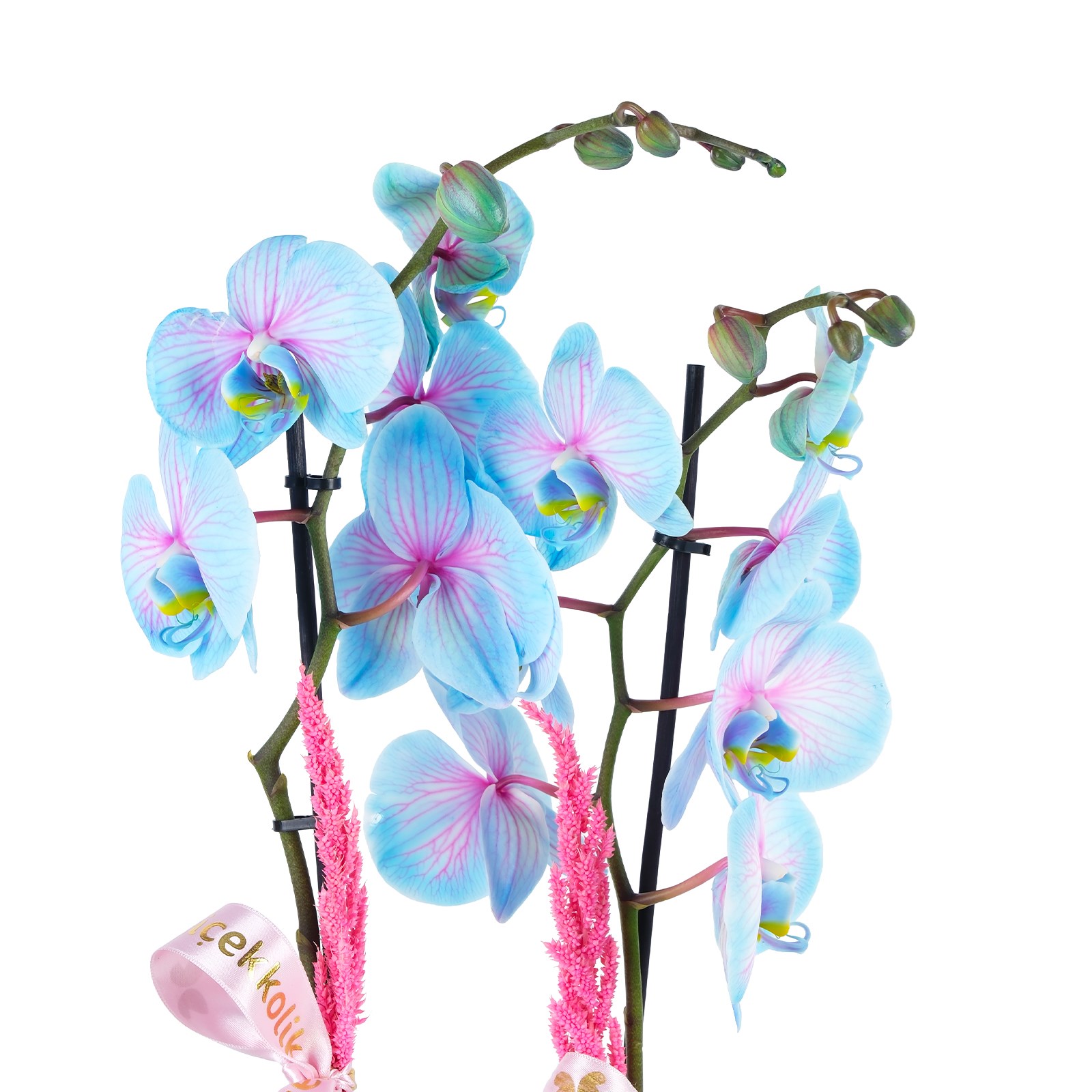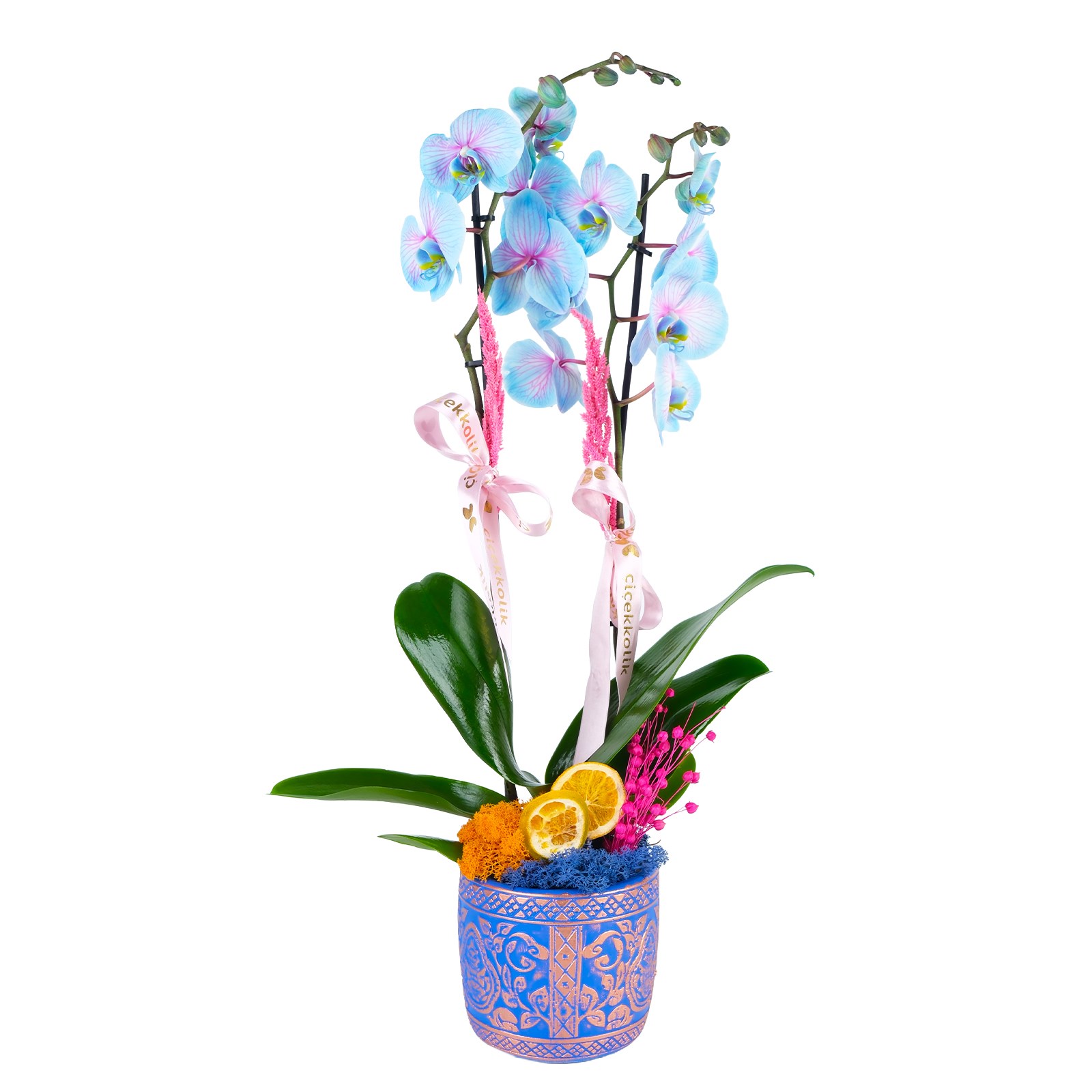 Zarif görünümü ve eşsiz rengiyle Gold Royal Çiftli Mavi Orkide, yaşam alanlarına modern bir dokunuş kazandırır. Mavi Beton Saksısı ve pembe kurdele detayıyla hem sofistike hem de dikkat çekici bir tasarım sunar.