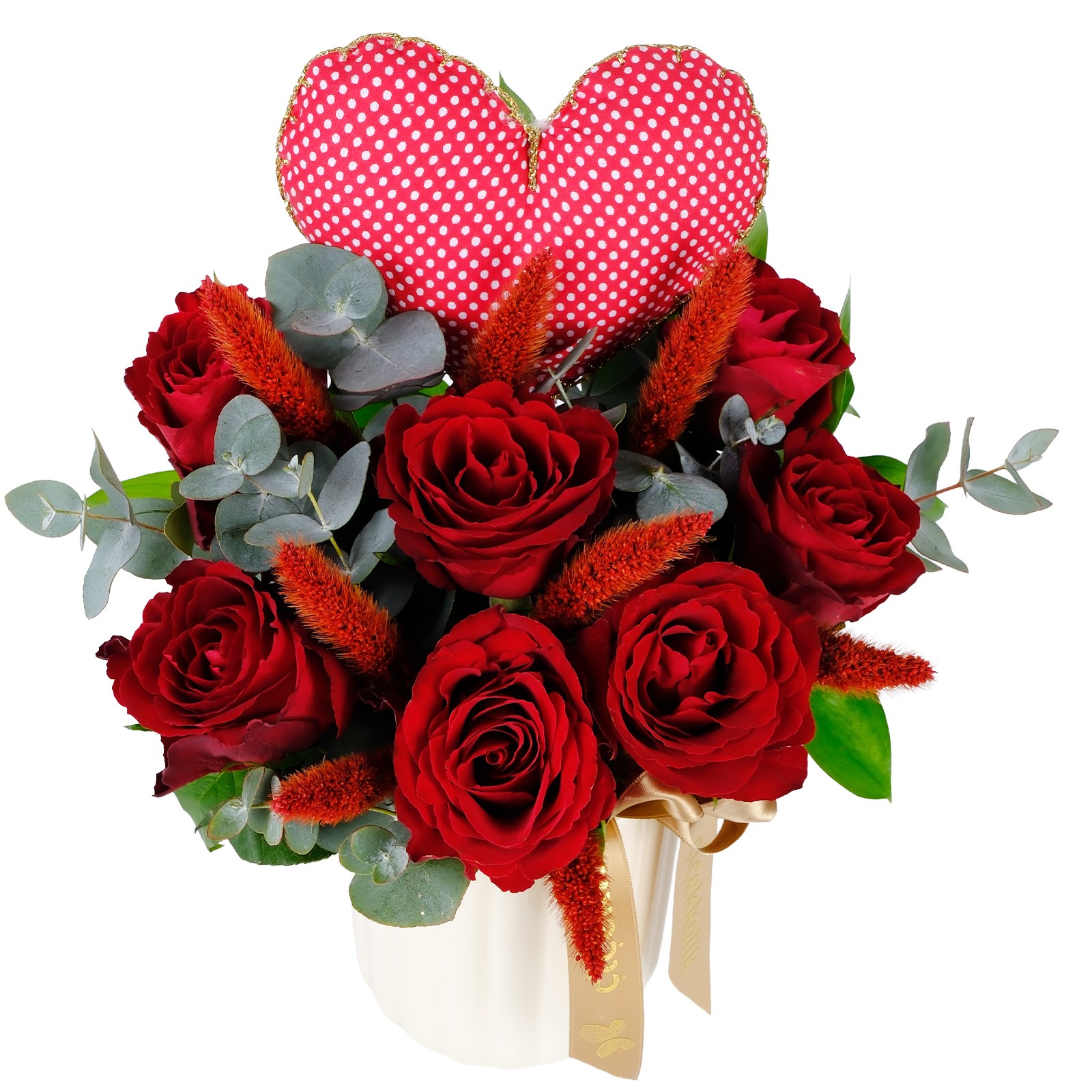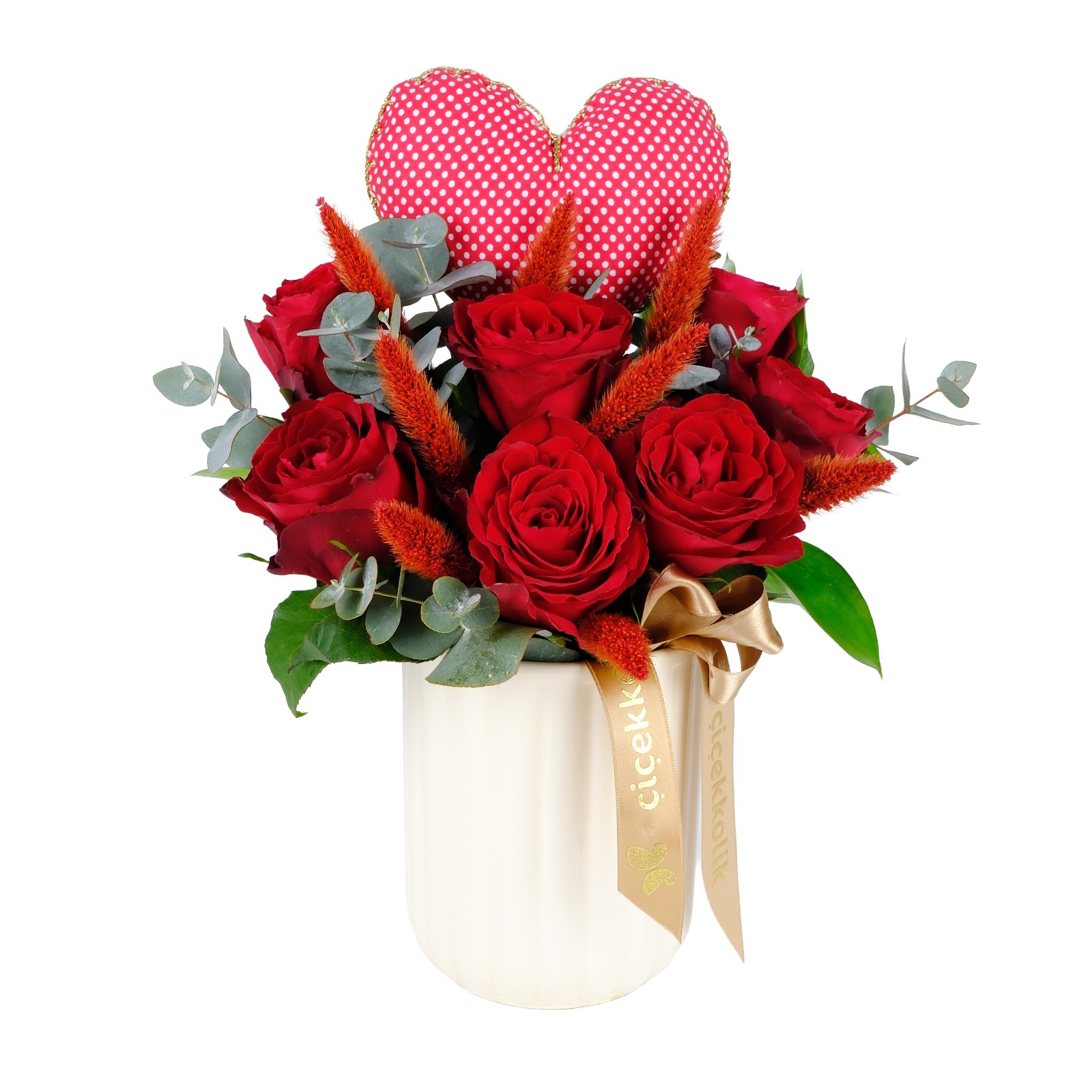 Enerjisi yüksek renklerin buluştuğu Heart Red Güller, modern ve ferah bir görünüm sunar. Kırmızı güller ve kuru çiçek dalları zarif bir kompozisyon oluşturur.