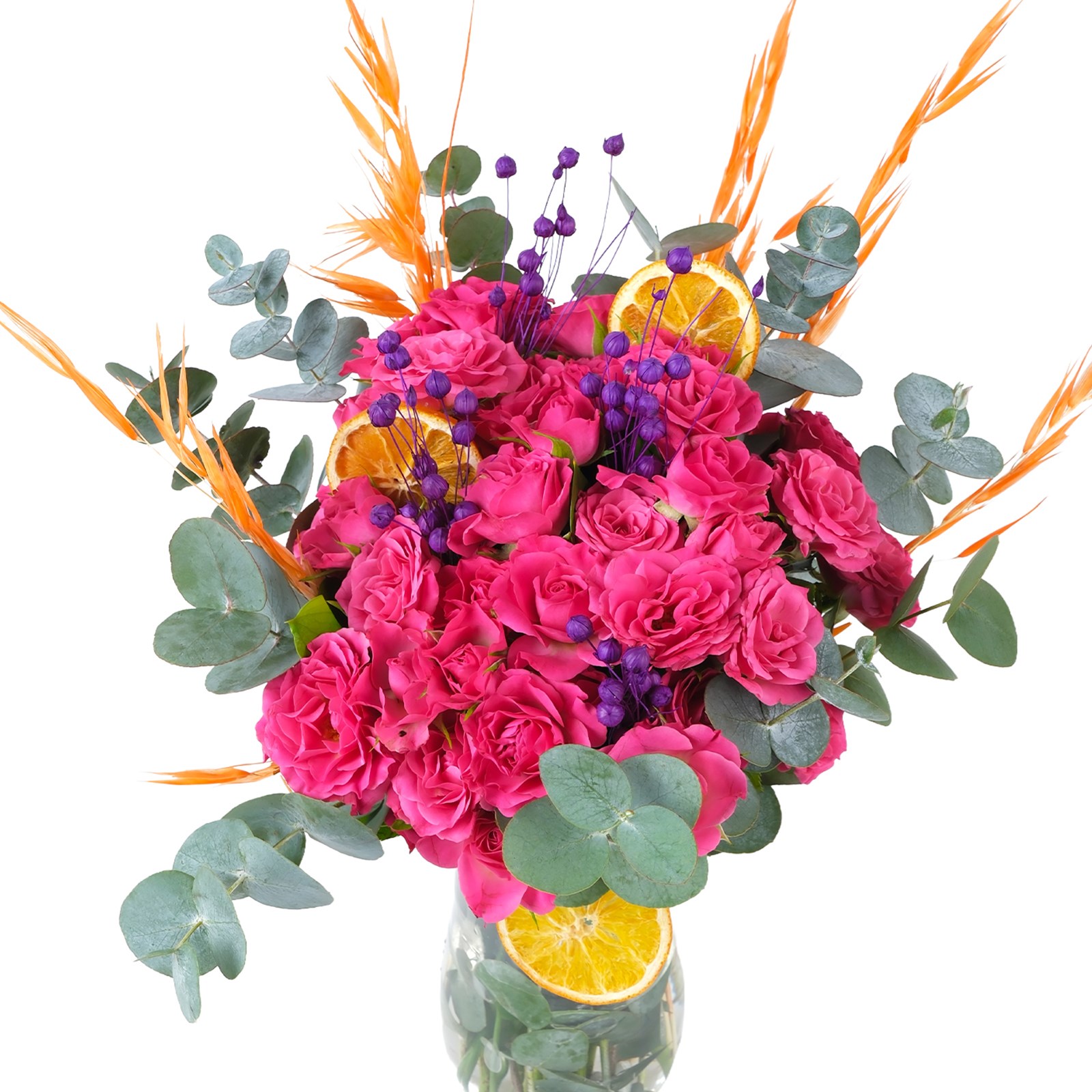 Çiçek Türleri:Pembe güller, kuru çiçekler, okaliptus dalları