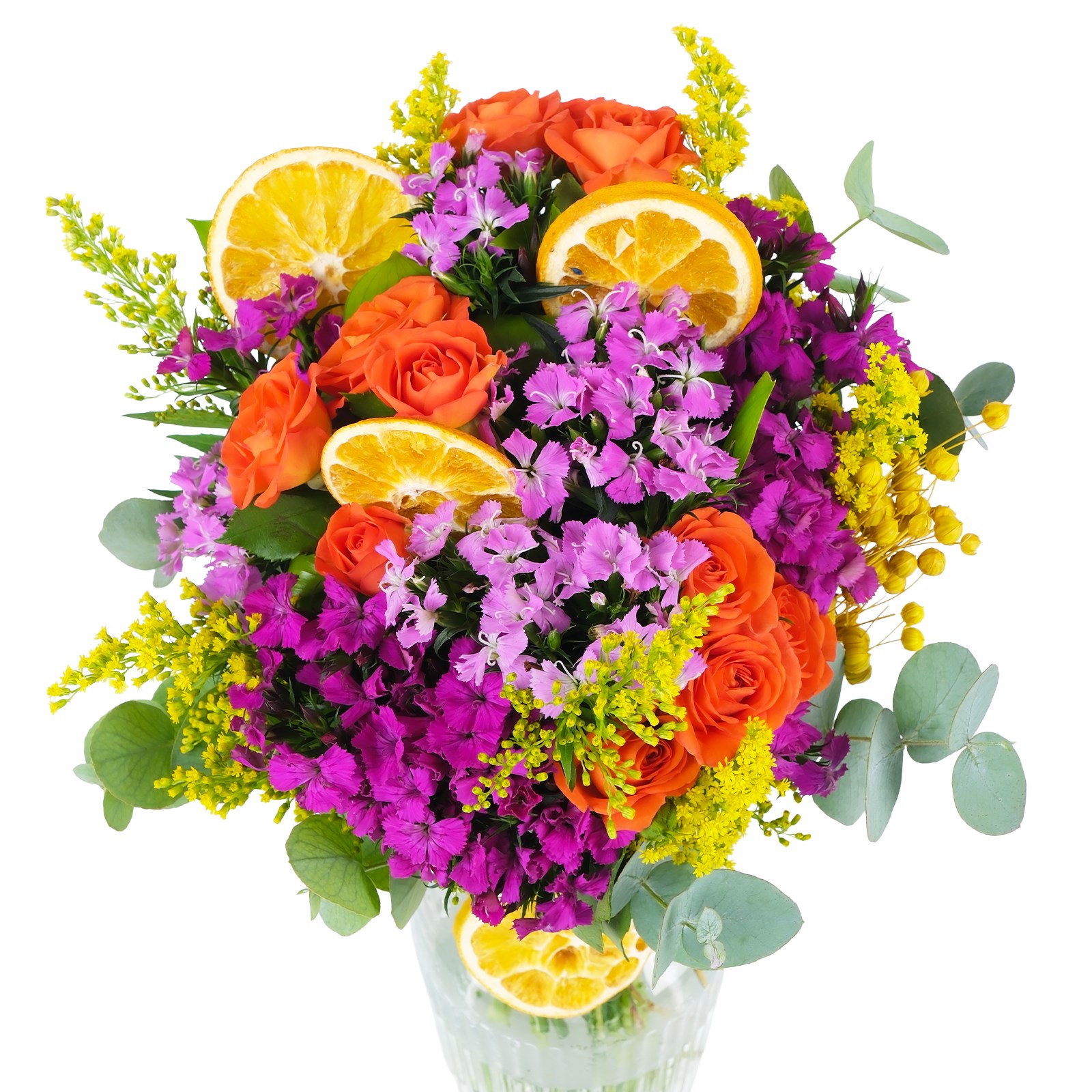 Çiçek türleri:Turuncu güller, hüsnüyusuf, okaliptus yaprakları