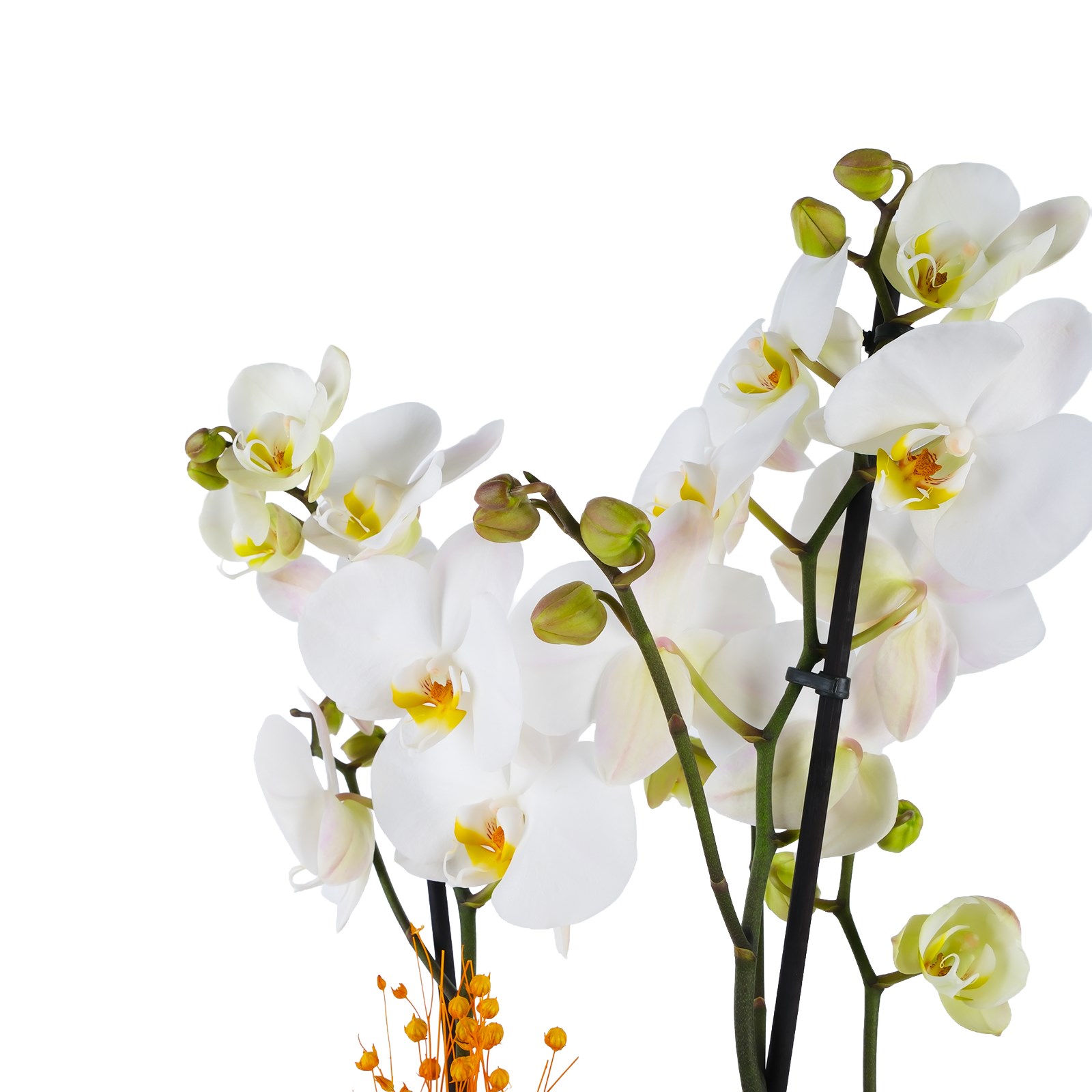 Zarif görünümü ve eşsiz rengiyle Jungle Cruise Çİft Dallı Beyaz Orkide, yaşam alanlarına modern bir dokunuş kazandırır. Kahve Beton Saksısı ve Turuncu kurdele detayıyla hem sofistike hem de dikkat çekici bir tasarım sunar.
