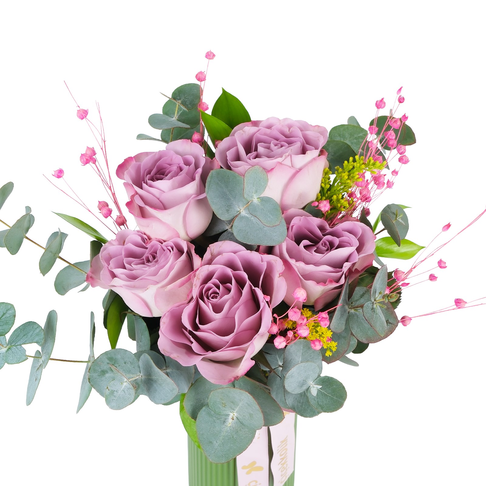 Enerjisi yüksek renklerin buluştuğu Lavender Dream Kiss Lila Gül, modern ve ferah bir görünüm sunar. Lila güller, okaliptus dalları ve kuru çiçek dalları zarif bir kompozisyon oluşturur.