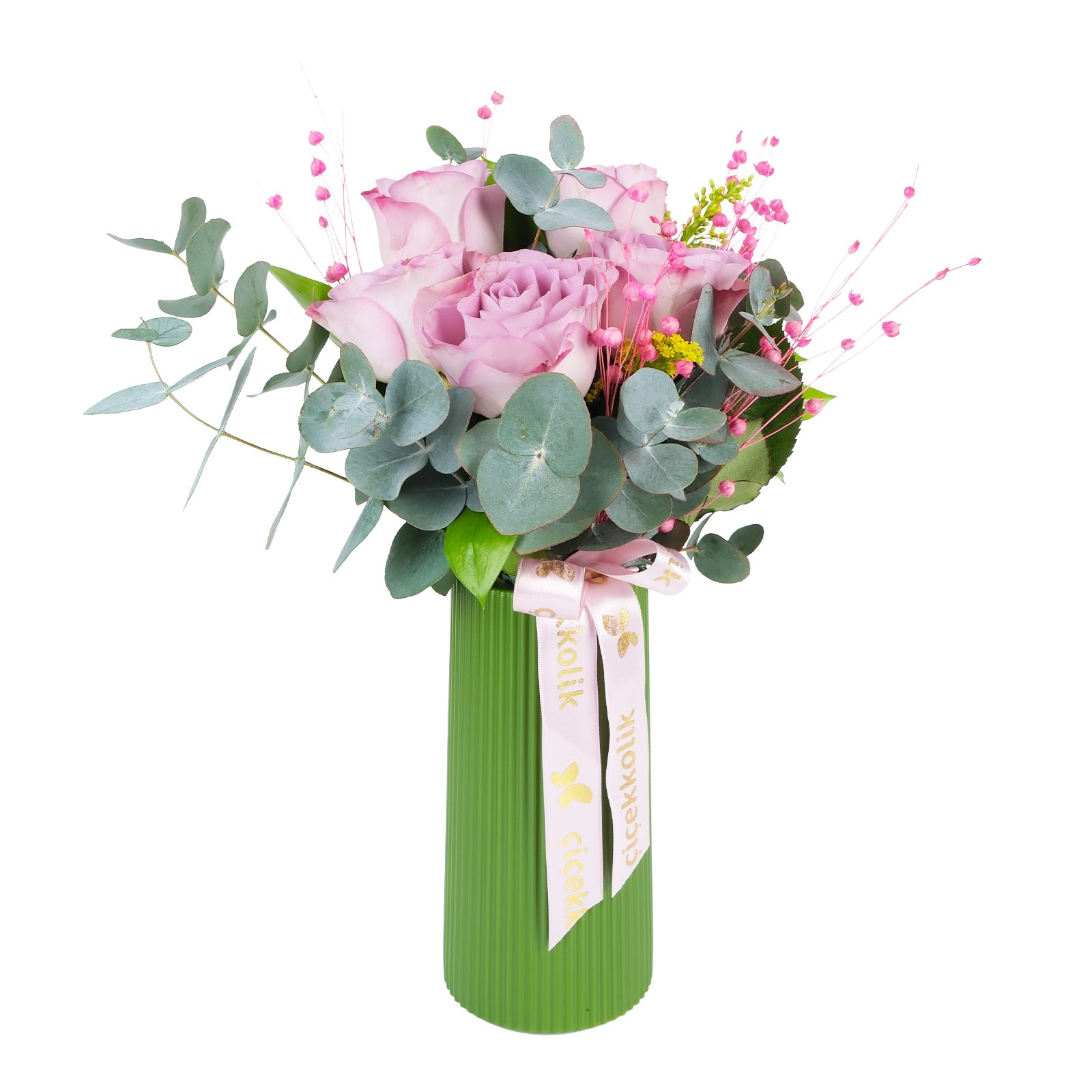 • Yeşil polimer vazo ve pembe detaylar