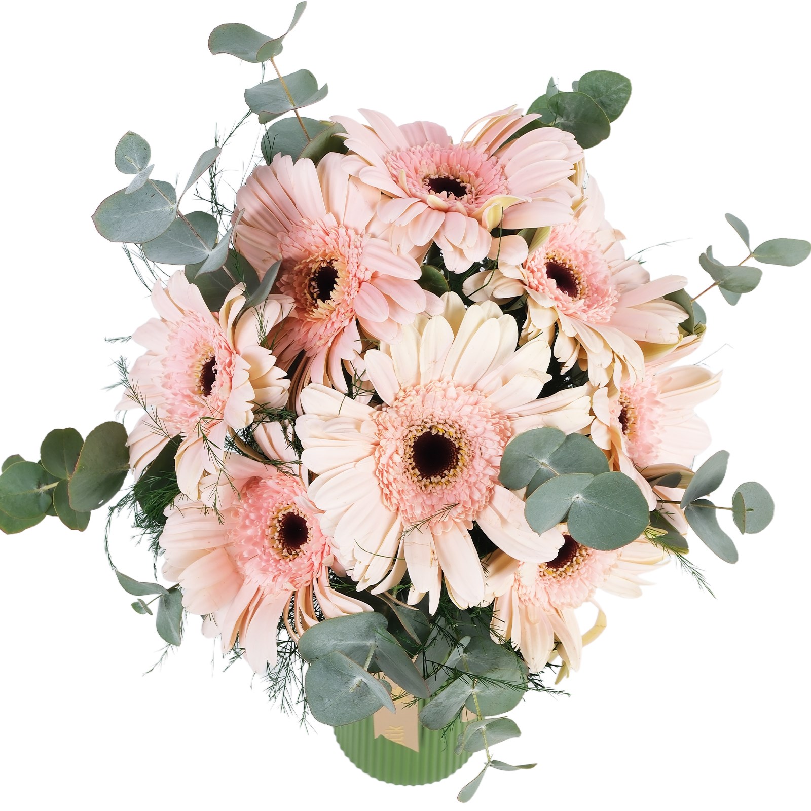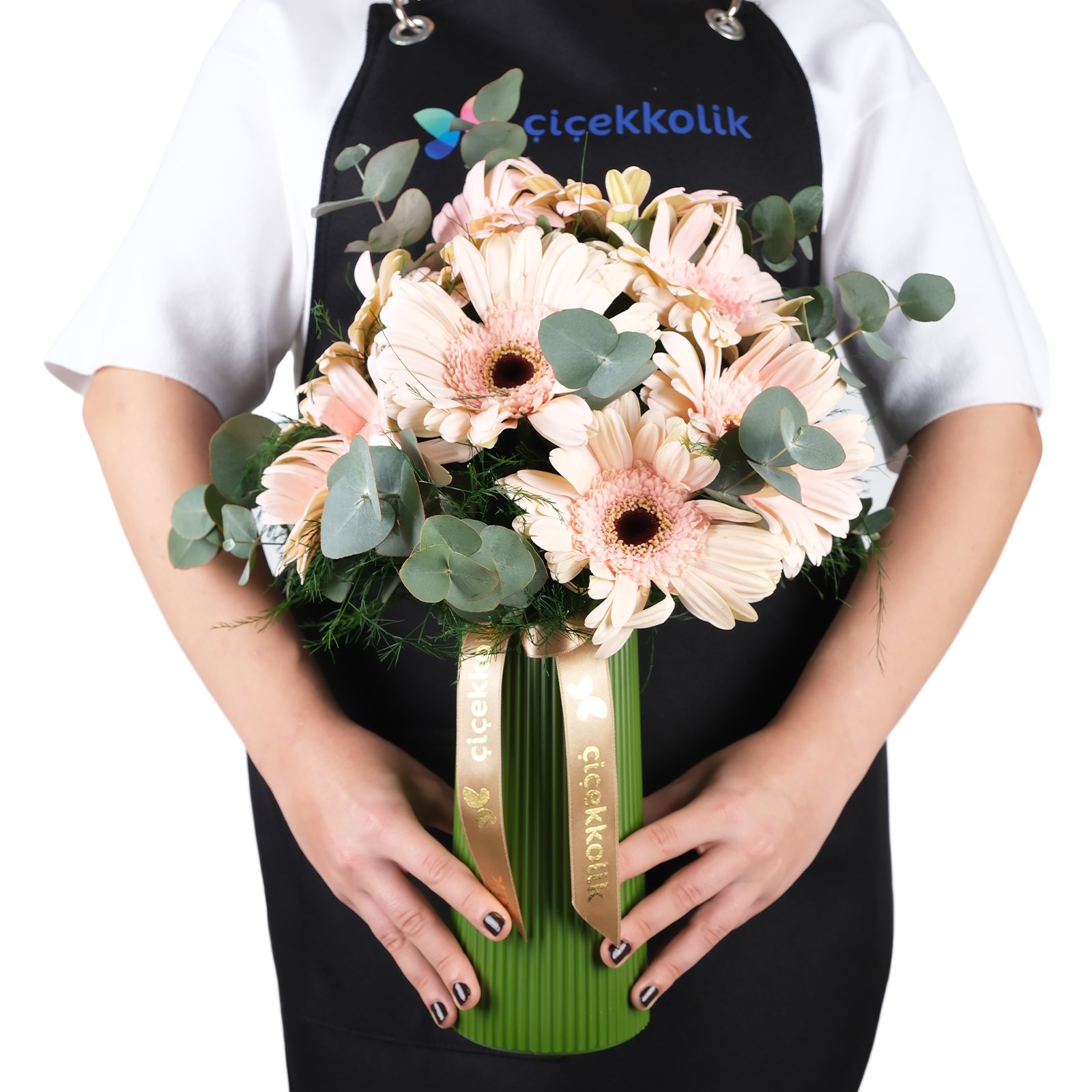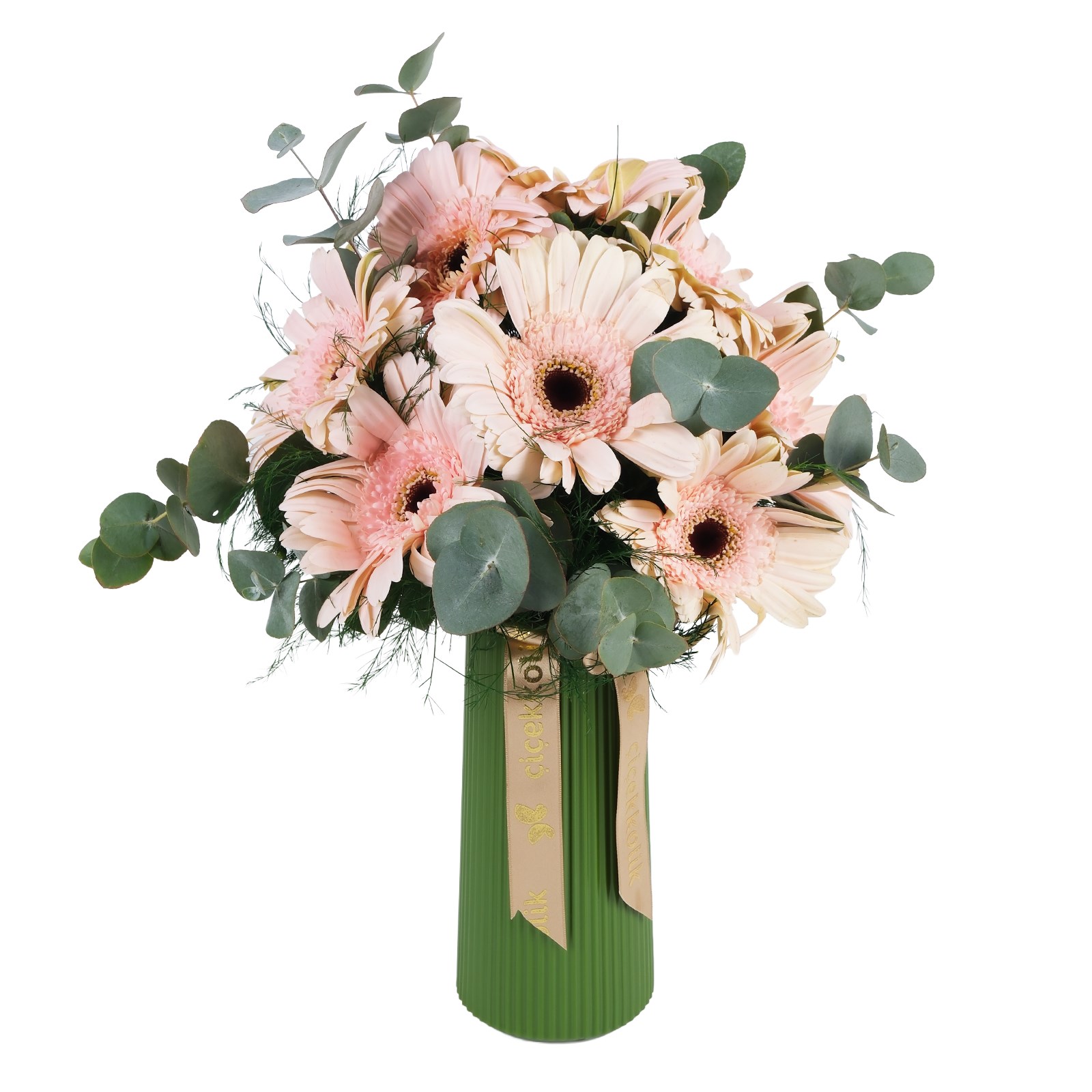Zarif ve sade bir görünüm sunan bu Light Powder Pink Gerberalar Vazosu, modern yeşil vazo ile şık bir kontrast oluşturur. Tropik yeşilliklerin doğal kokusu ve gerberaların tazeliğiyle ev ve ofis dekoruna hafiflik katar.
