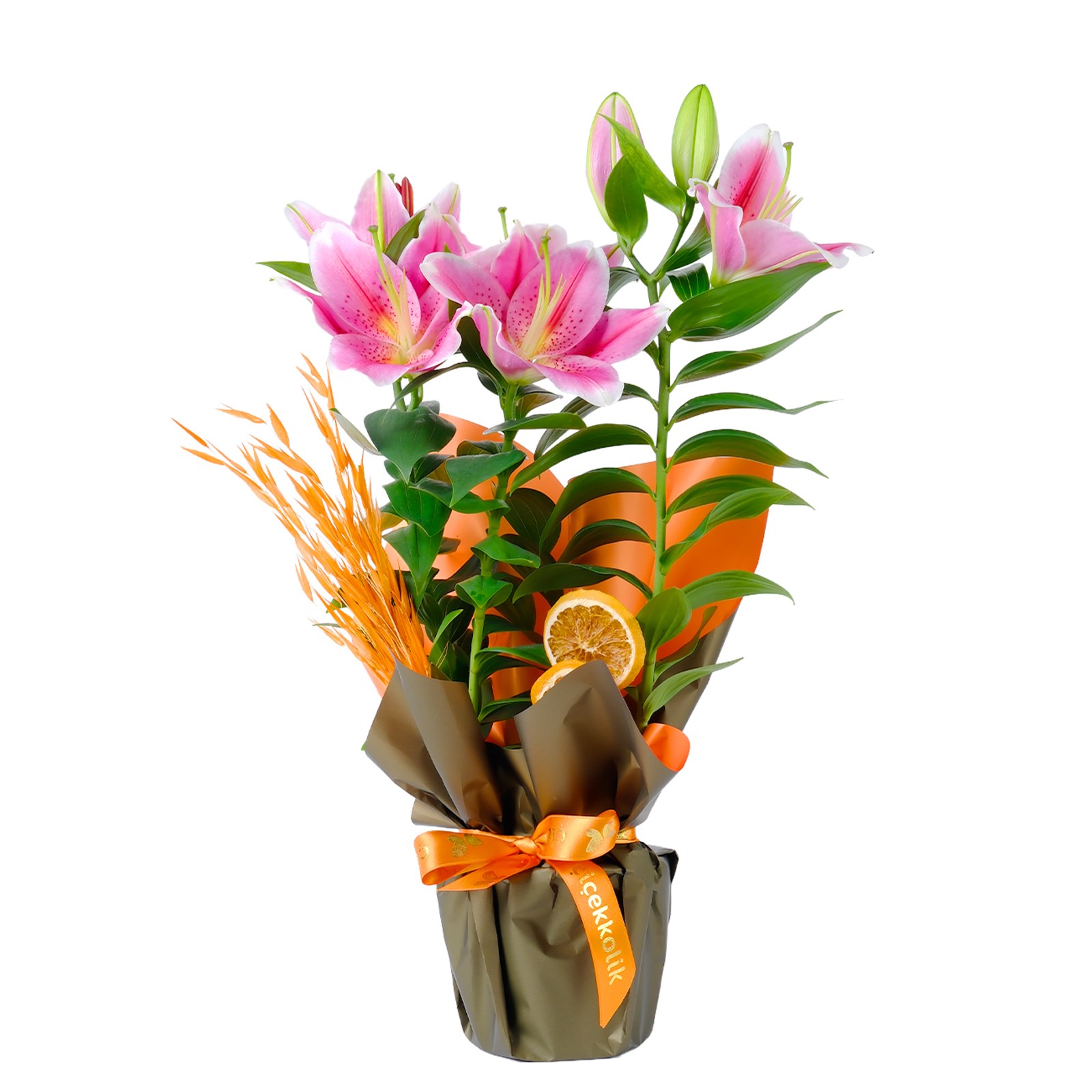 Lily's Garden pembe saksı lilyum, Floral designers ekibimizin özenle tasarladığı, neşeli ve sade bir saksı çiçeğidir. Bu şık saksı bitkisi, evinize zarif bir dokunuş katarken hoş bir kokuda sunar.Tedarik kaynaklı tomurcuk olarak gönderilmektedir.