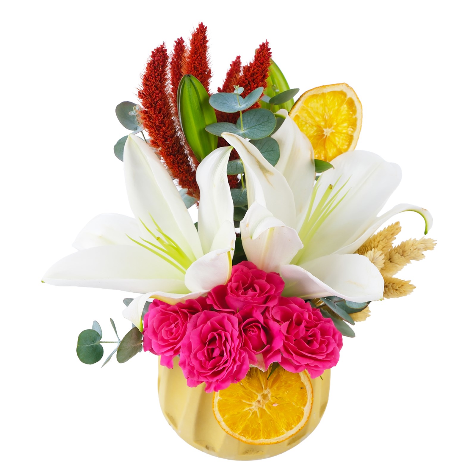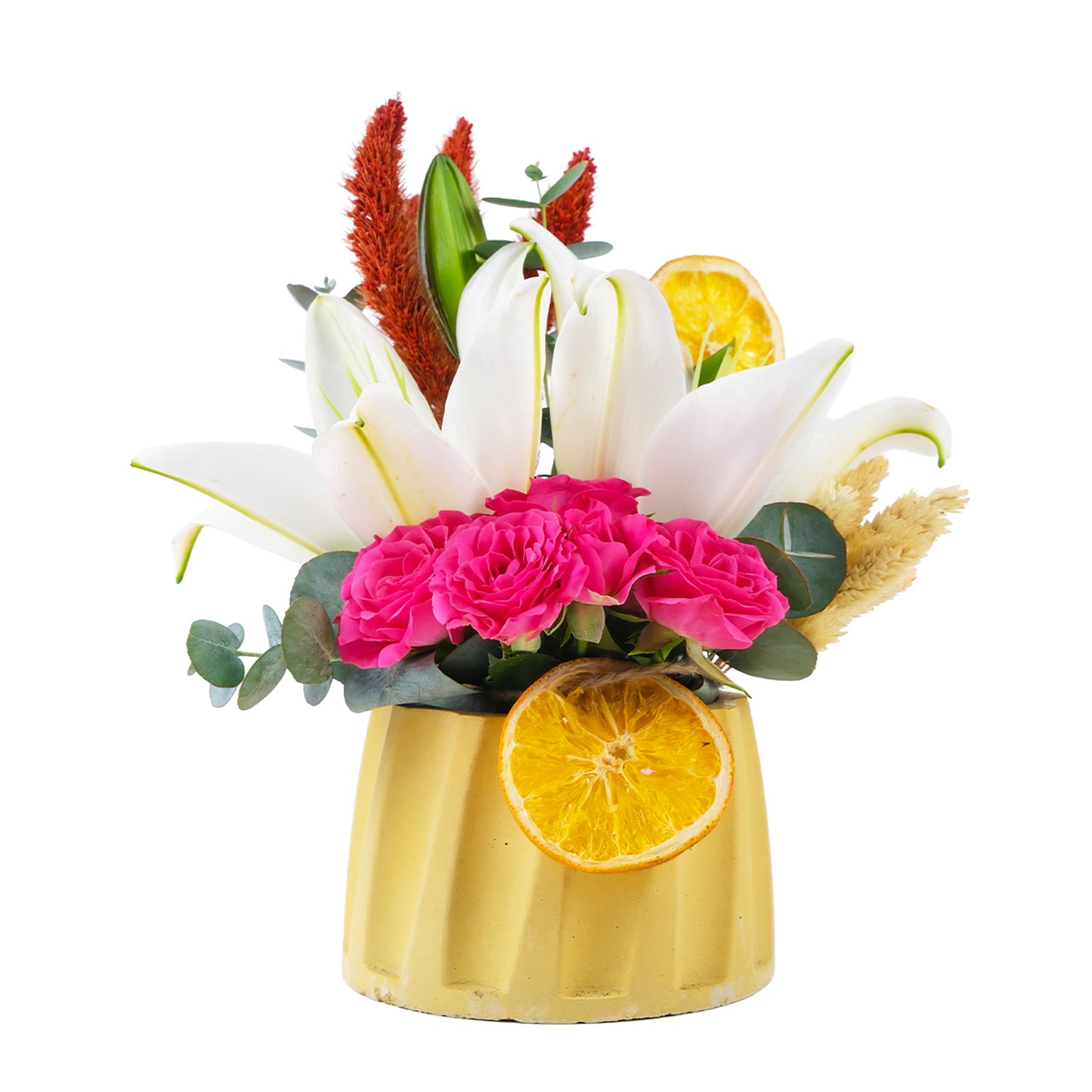 Pembe güller ve lilyumların romantizmi Lindo Mix Aranjman, aşkın en tutkulu halini yansıtıyor. Modern tasarım sofistike kontrastı, çarpıcı bir görsel sunarken okaliptus yaprakları kuru çiçekleriyle eşsiz bir dokunuş kazanılmıştır.