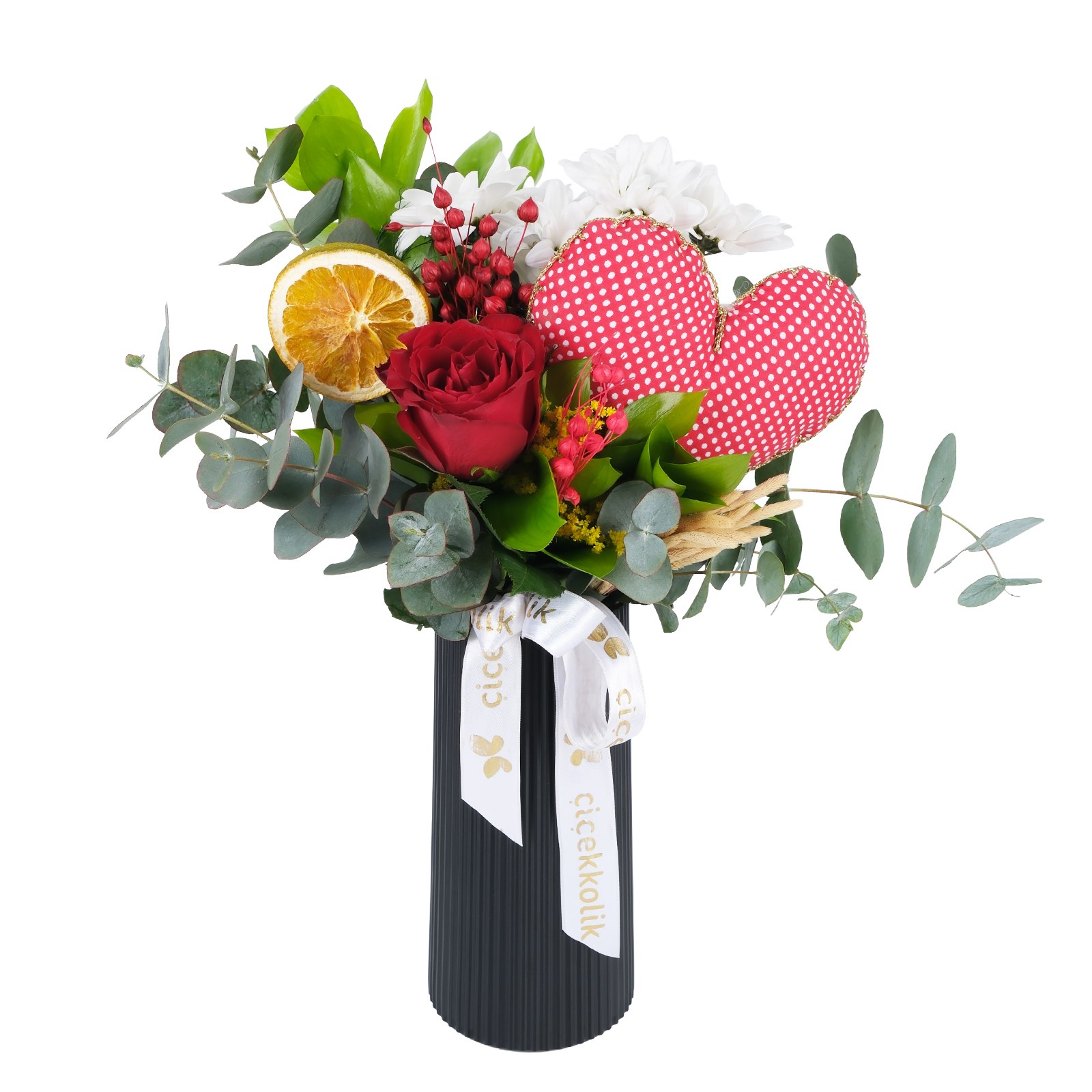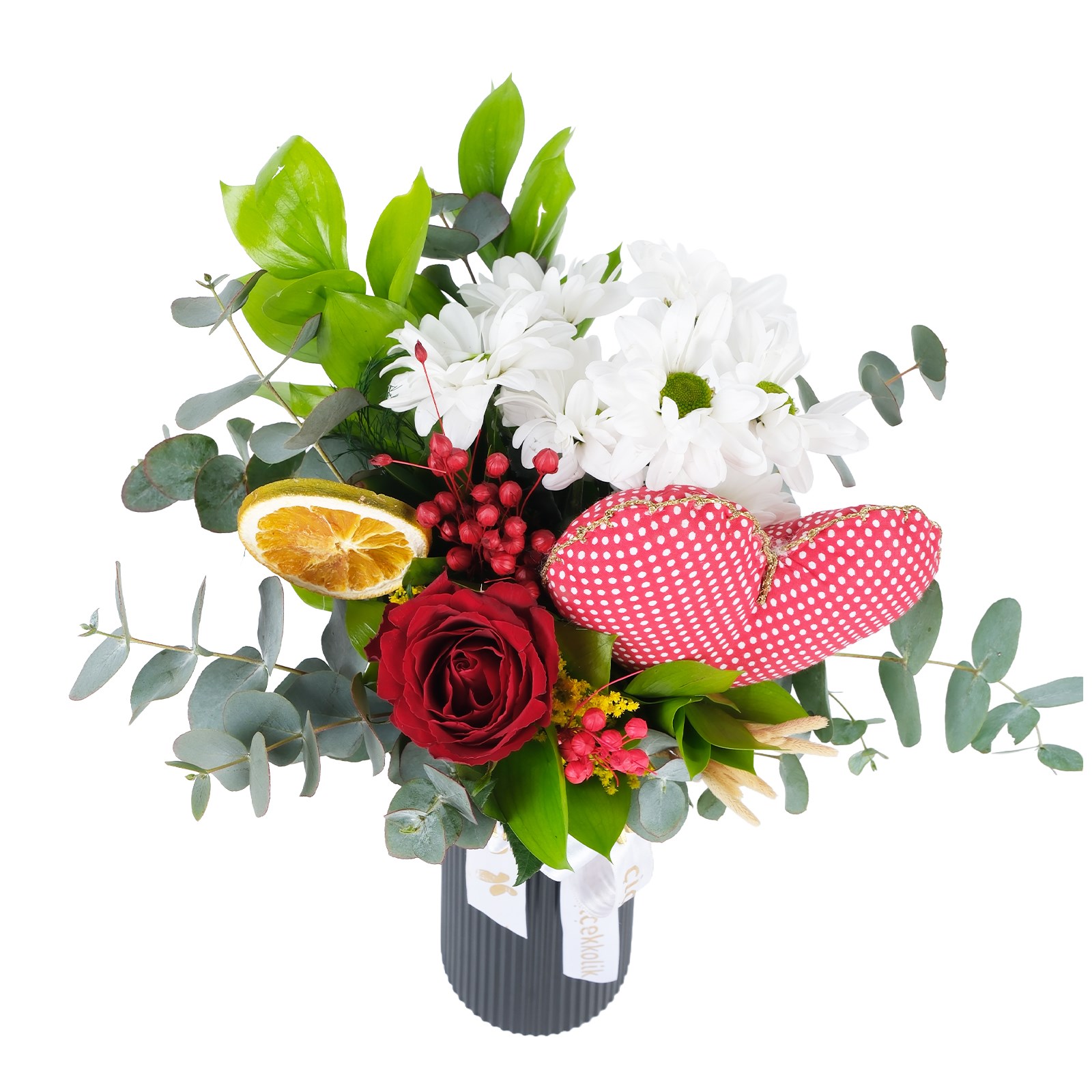 Enerjisi yüksek renklerin buluştuğu Love's Daisy Heart Papatyalar, modern ve ferah bir görünüm sunar. Kırmızı güller, papatya okaliptus dalları ve kuru çiçek dalları zarif bir kompozisyon oluşturur.