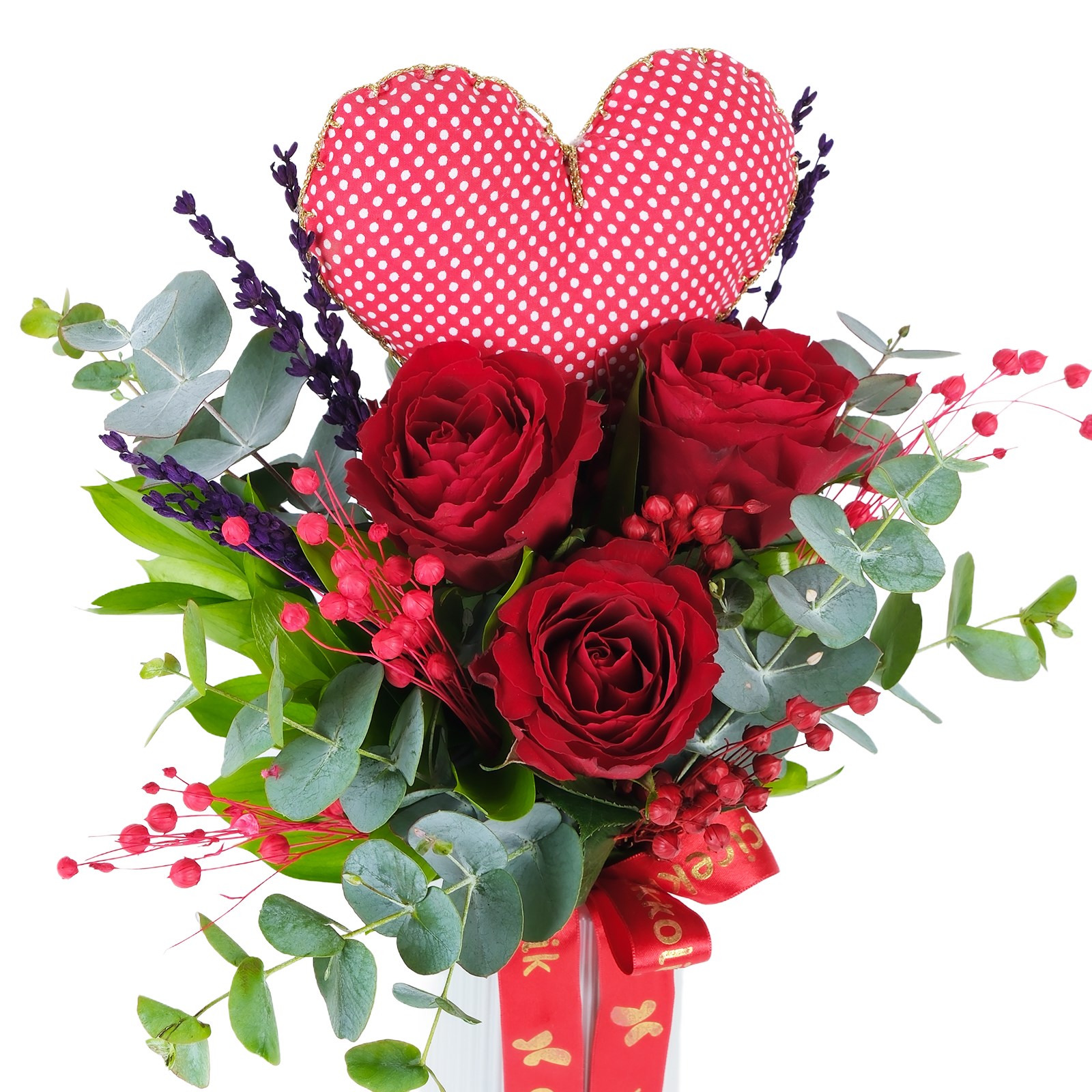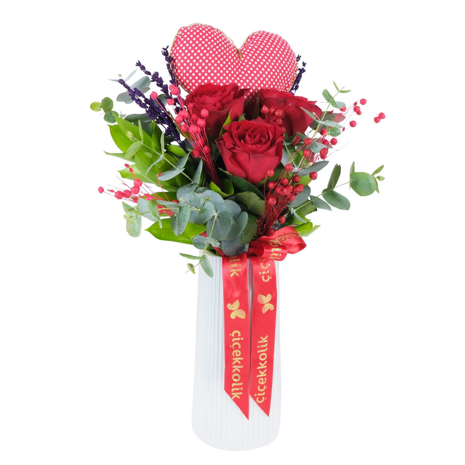Enerjisi yüksek renklerin buluştuğuLove Tree Red Roses, modern ve ferah bir görünüm sunar. Kırmızı güller, okaliptus dalları ve kuru çiçek dalları zarif bir kompozisyon oluşturur.