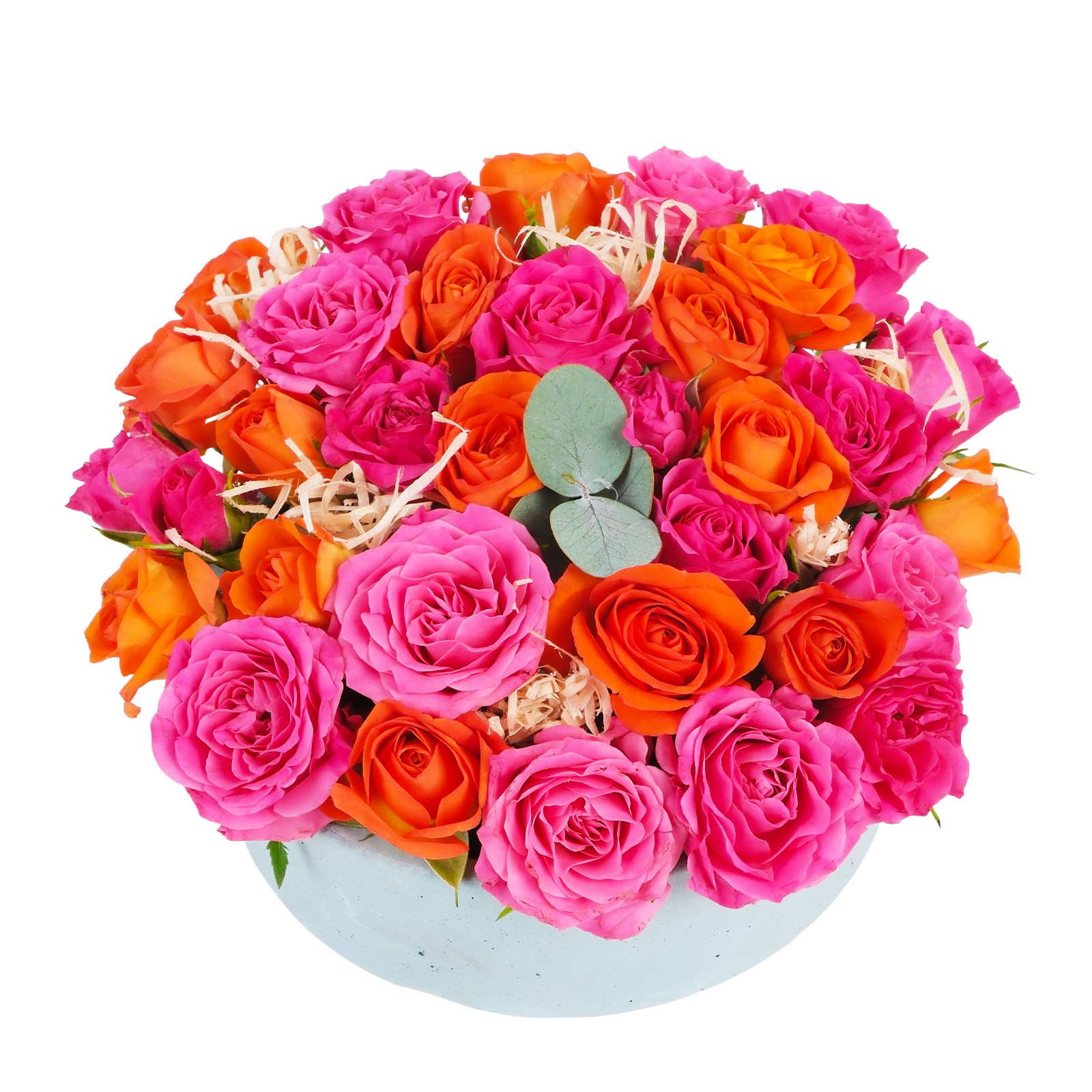 Pembe ve turuncu sprey güllerin sıcak enerjisi, bu zengin aranjmanda kışın en doğal detaylarıyla bir araya geliyor. Canlı pembe ve turuncu güllerin dolgun duruşu; hem görsel hem de aromatik şölen sunuyor. Beton vazosuyla bu tasarım, her mekan modern ve samimi bir hava katar.