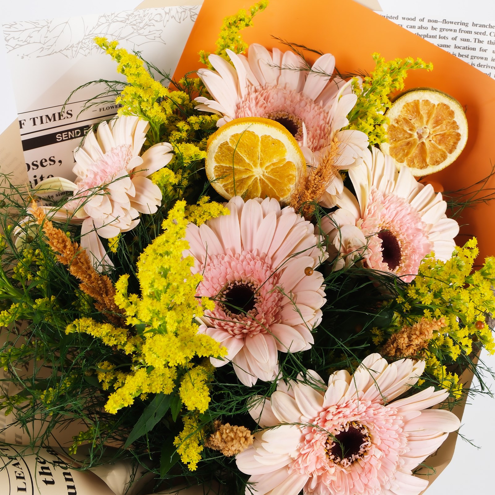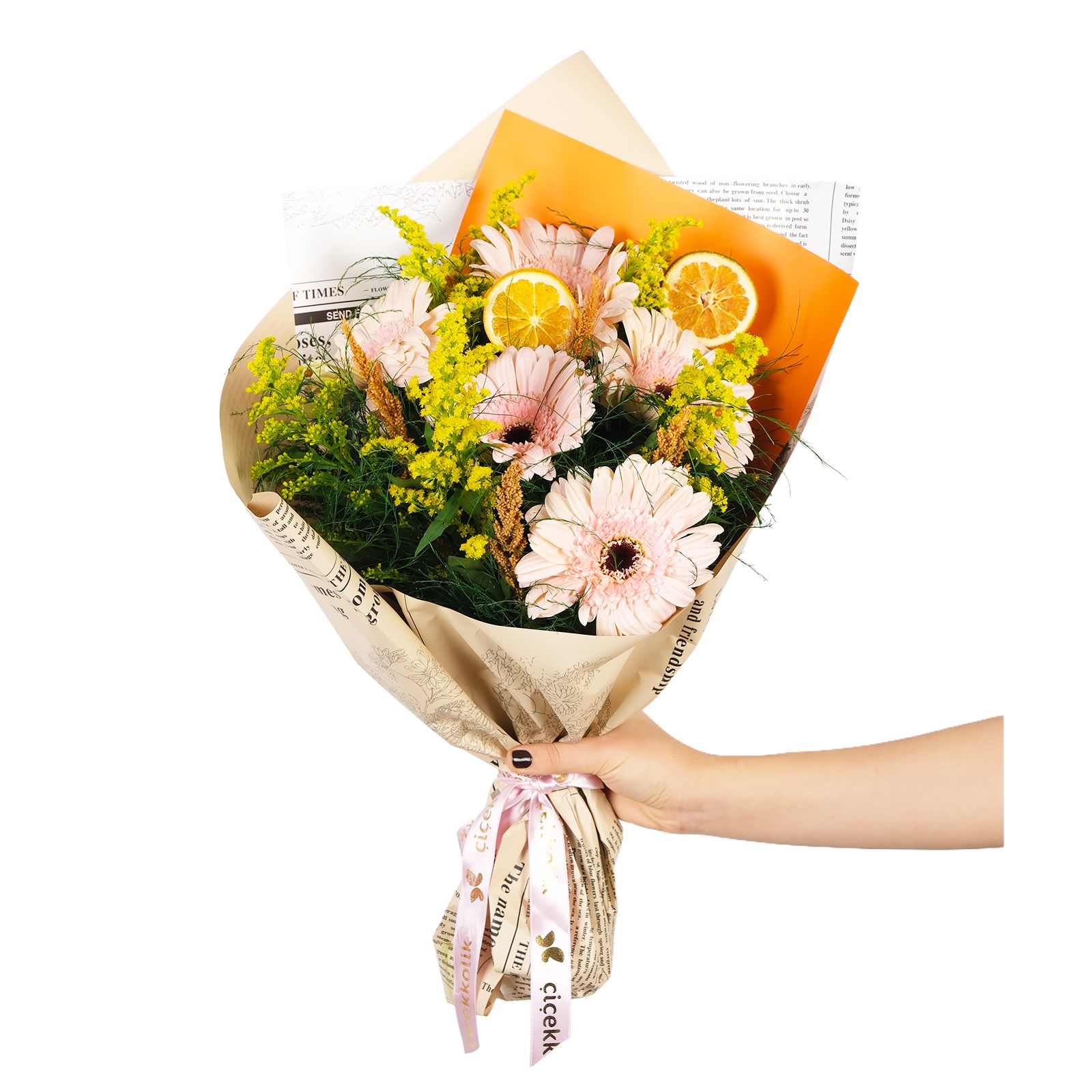Pink gerberaların saçtığı pozitif enerji, gazete ambalajın doğal kokusu ve modern gazete ambalajla birleşerek sevdiklerine en samimi duygularını taşıyor.Bukete eşlik eden kuru çiçekler tasarıma hem rustik bir hava katıyor hem de doğanın renkli bir yansımasını sunuyor.