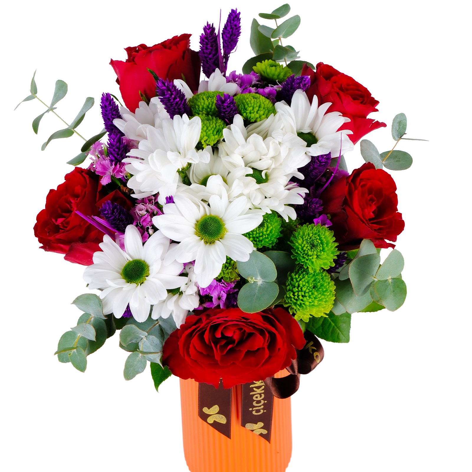 Çiçek türleri:Beyaz papatyalar, okaliptus yaprakları ve kırmızı güller