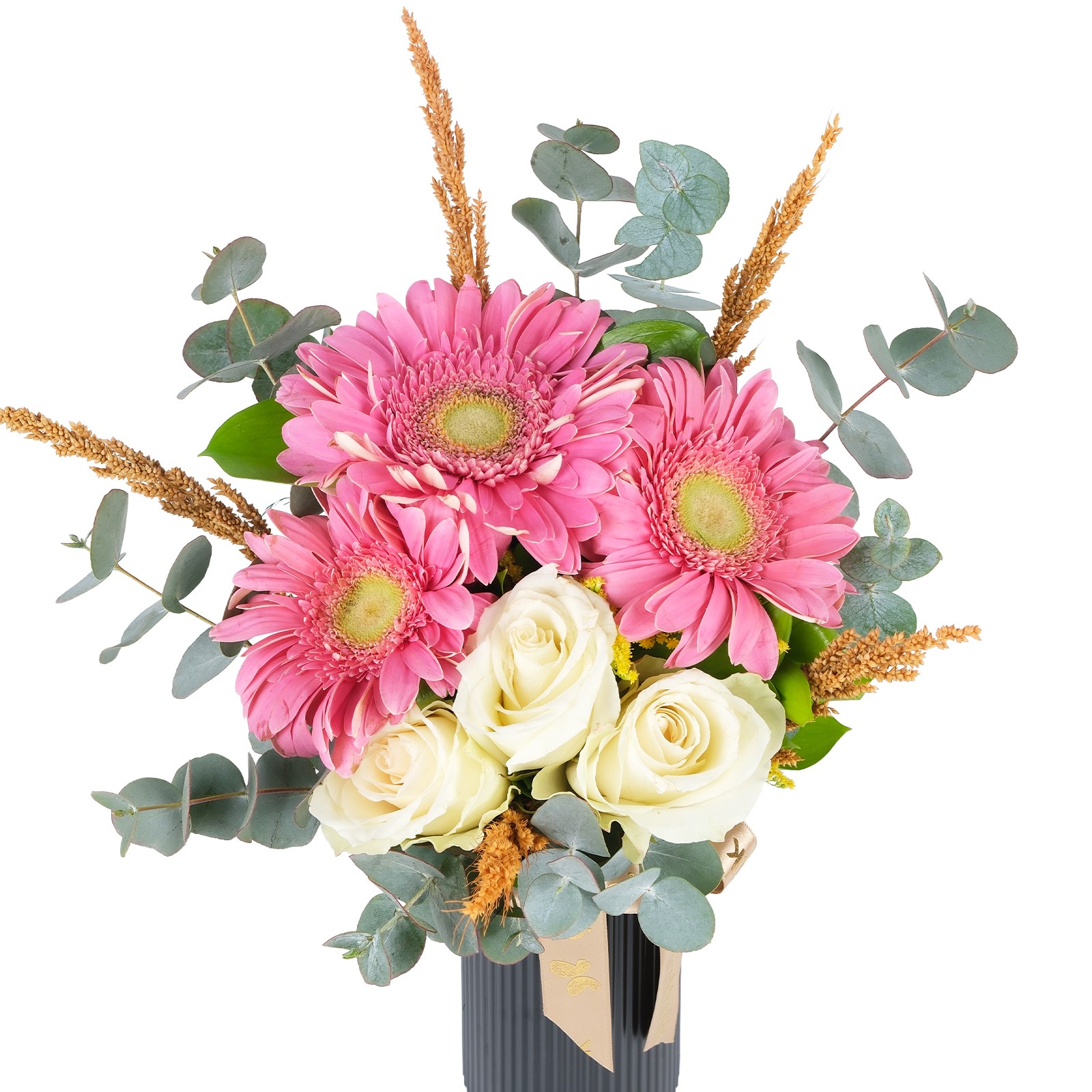 • Pembe gerbera, beyaz gül ve kuru çiçek karışımı