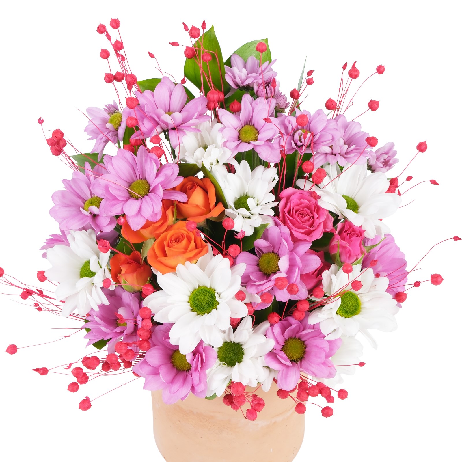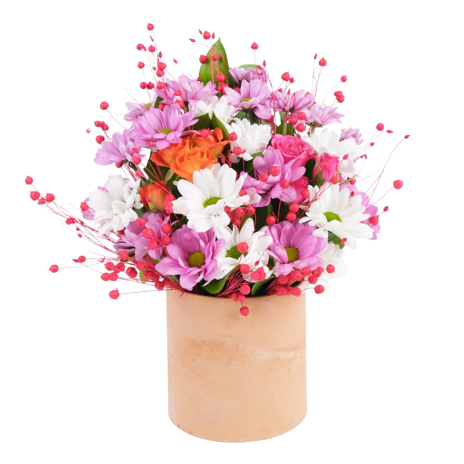 Pembe ve turuncu güllerin papatyalar ile sıcak enerjisi, bu zengin aranjmanda kışın en doğal detaylarıyla bir araya geliyor. Canlı pembe ve turuncu güllerin dolgun duruşu; kuru çiçekler ile birleşerek hem görsel hem de aromatik şeçim sunuyor. Beton vazosuyla bu tasarım, her mekan modern ve samimi bir hava katar.