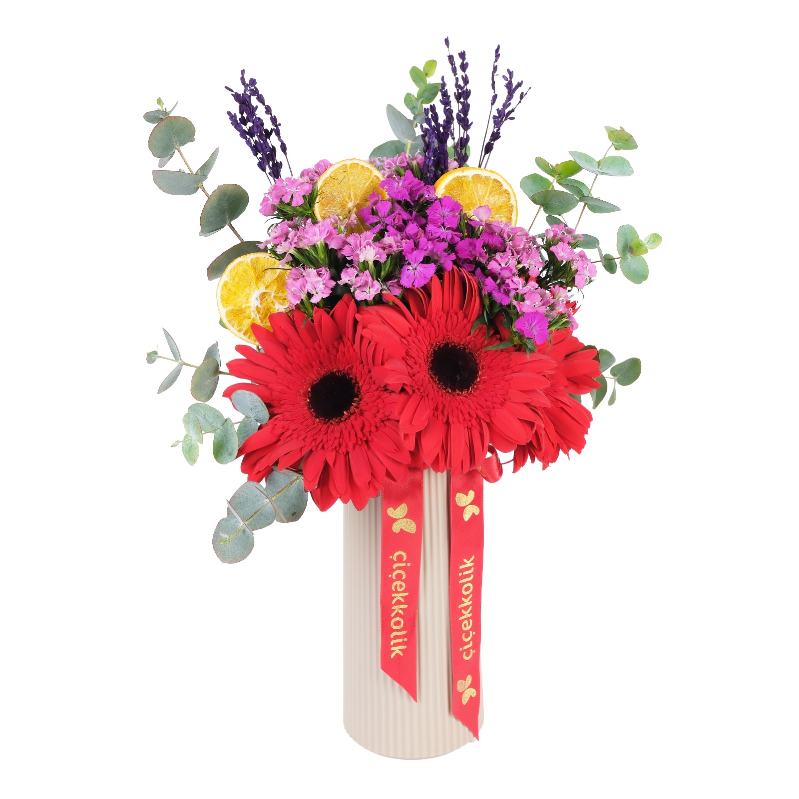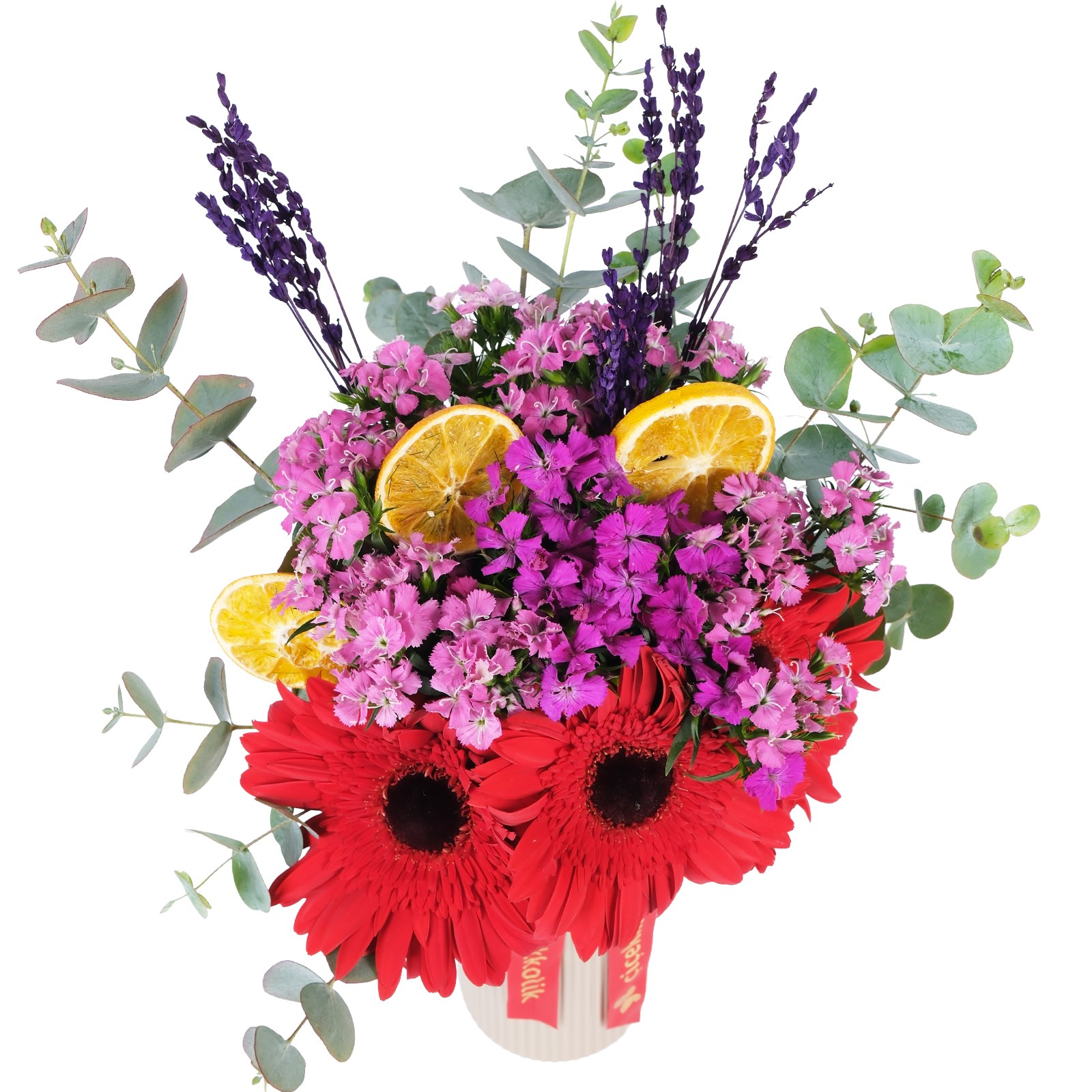 • Kırmızı gerbera, hüsnüyusuf ve kuru çiçek karışımı