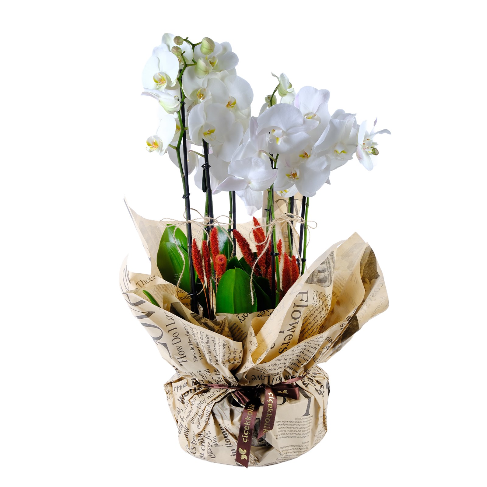 Zarif görünümü ve eşsiz rengiyle 6 Dallı Beyaz Orkide, yaşam alanlarına modern bir dokunuş kazandırır. Özel saksı ve Kahverengi kurdele detayıyla hem sofistike hem de dikkat çekici bir tasarım sunar.