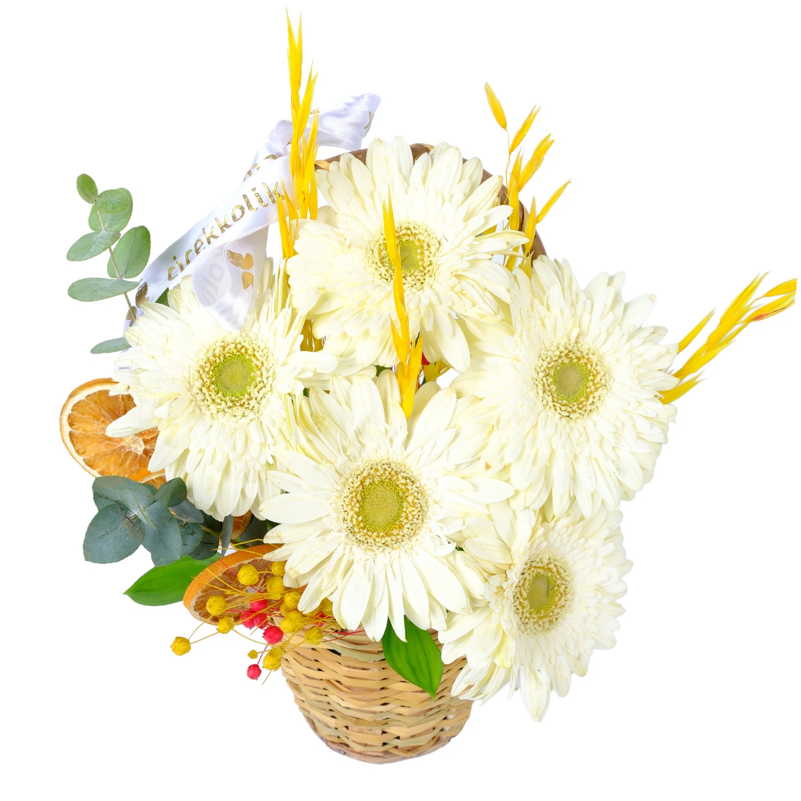 Nature Grace Beyaz Gerbera Aranjmanı, doğal kokulu hasır sepet içinde sunulan, beş beyaz gerbera oluşan sık bir aranjmandır.Hasır sepetle birleşerek, her türlü özel gün için mükemmel bir hediye seçeneği sunuyor.Bu aranjman, pembe ama etkileyici bir görünüm ile sevginizi, takdirinizi ya da özel duygularınızı en anlamlı şekilde ifade eder.