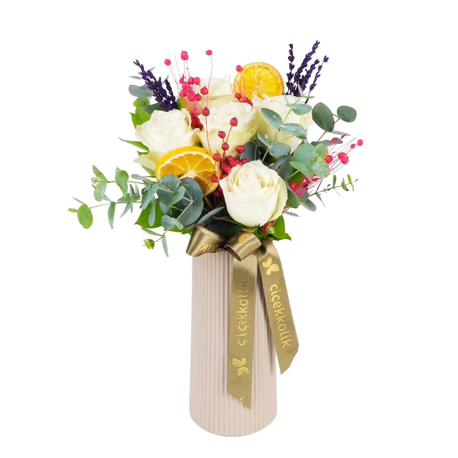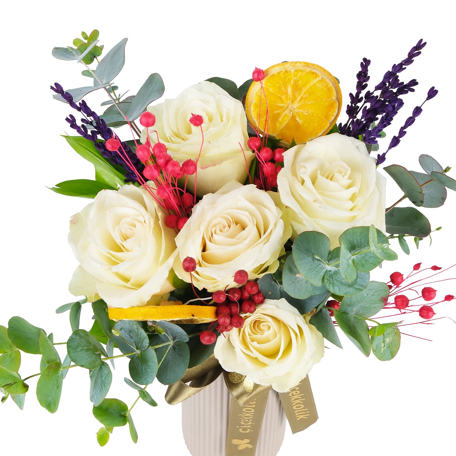 Enerjisi yüksek renklerin buluştuğu Novento Five White Vazoda Gül, modern ve ferah bir görünüm sunar. Beyaz güller, okaliptus dalları ve kuru çiçek dalları zarif bir kompozisyon oluşturur.