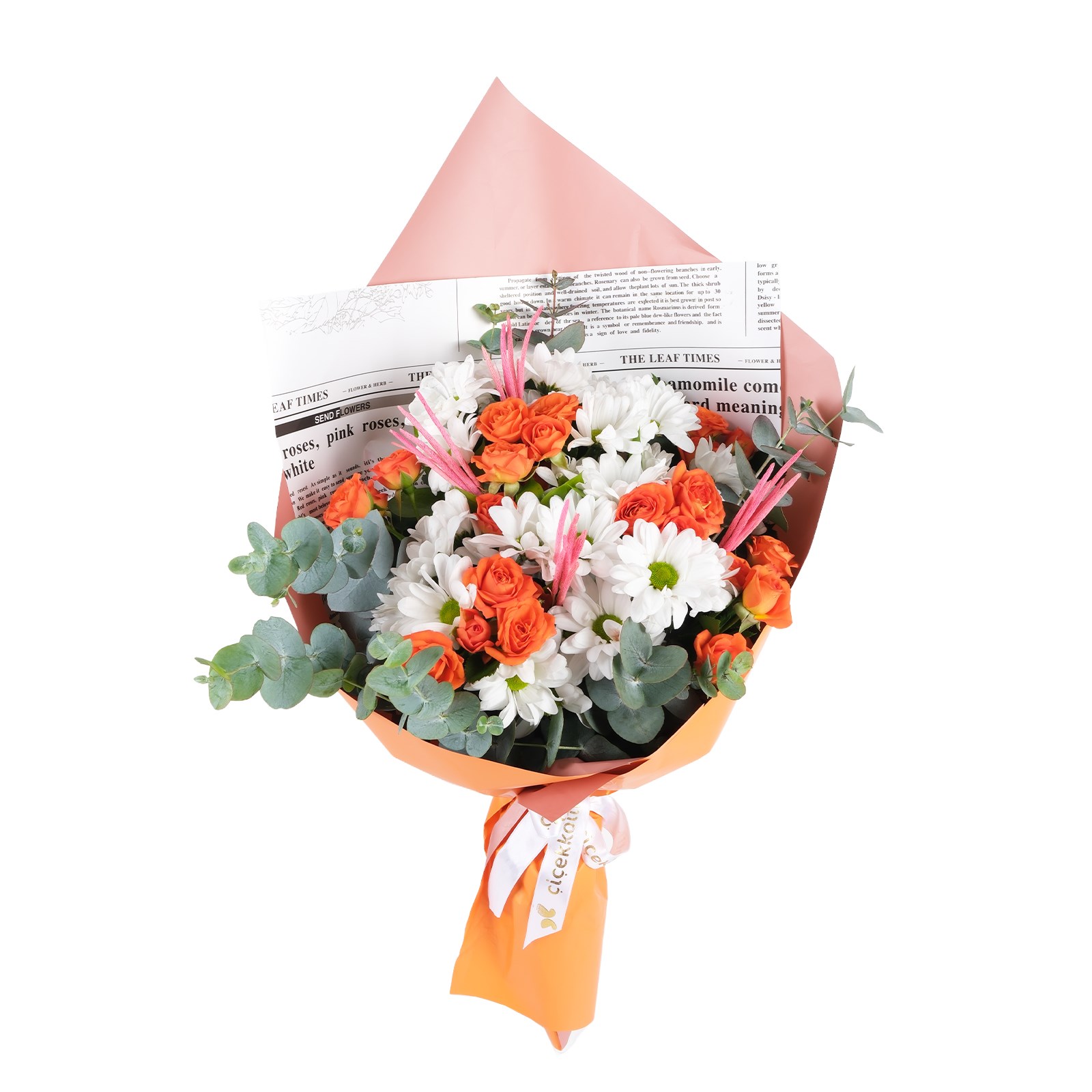 Turuncu güller ve beyaz papatya romantizmi Orange Daisy Çiçek Buketi, aşkın en tutkulu halini yansıtıyor. Modern tasarım ambalajın sofistike kontrastı, çarpıcı bir görsel sunarken okaliptus yaprakları, kuru çiçekleriyle eşsiz bir dokunuş kazanılmıştır.