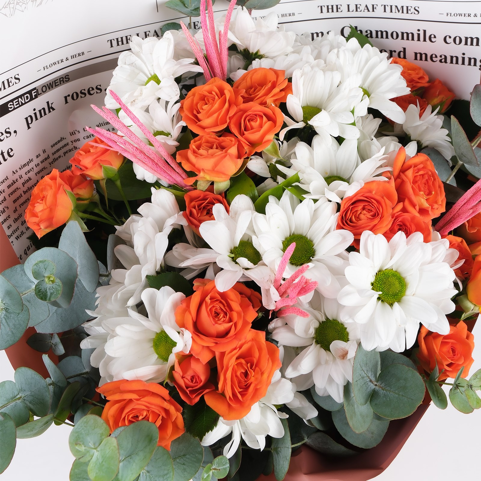 Çiçek Türleri:Turuncu güller, beyaz papatyalar, kuru çiçekler, okaliptus yaprakları
