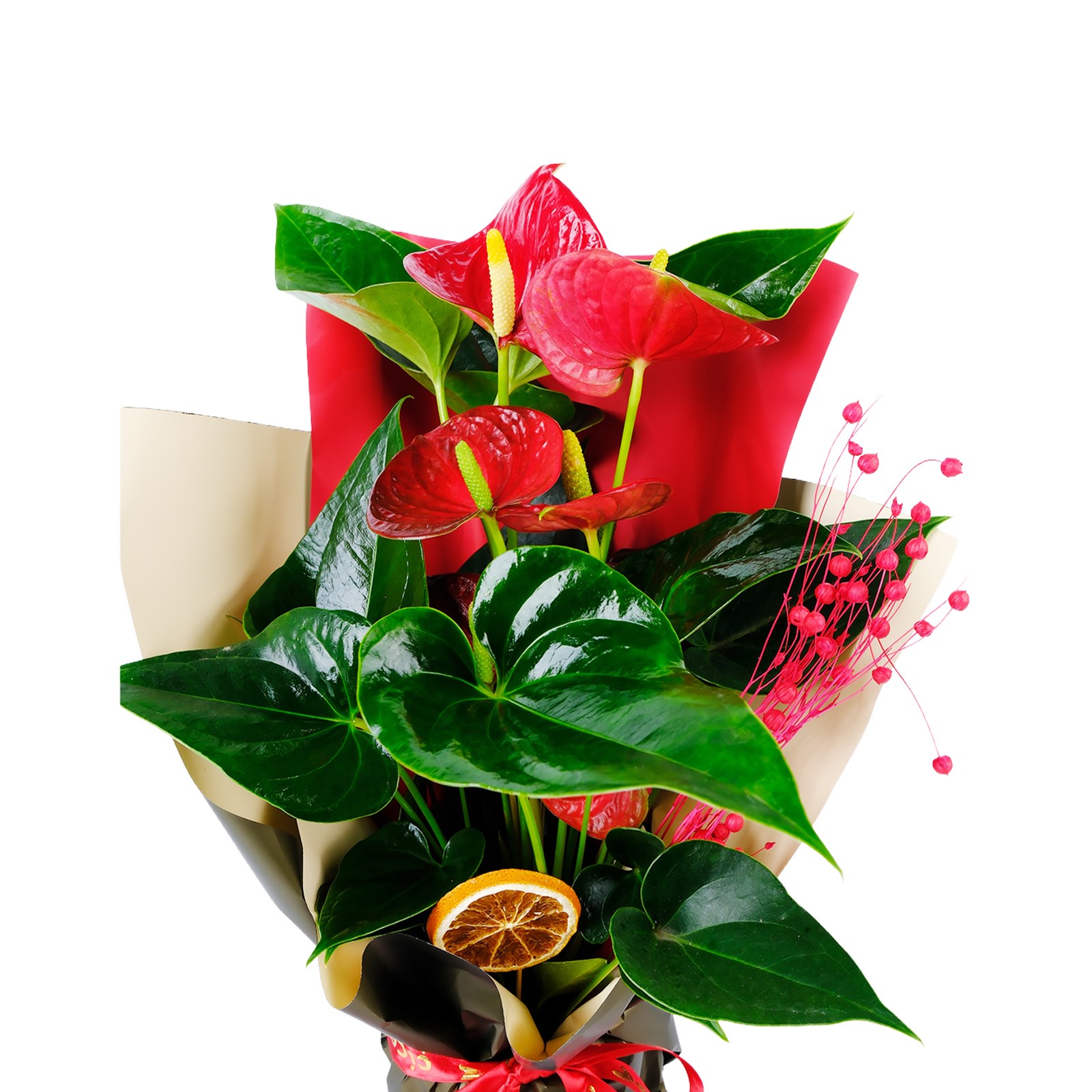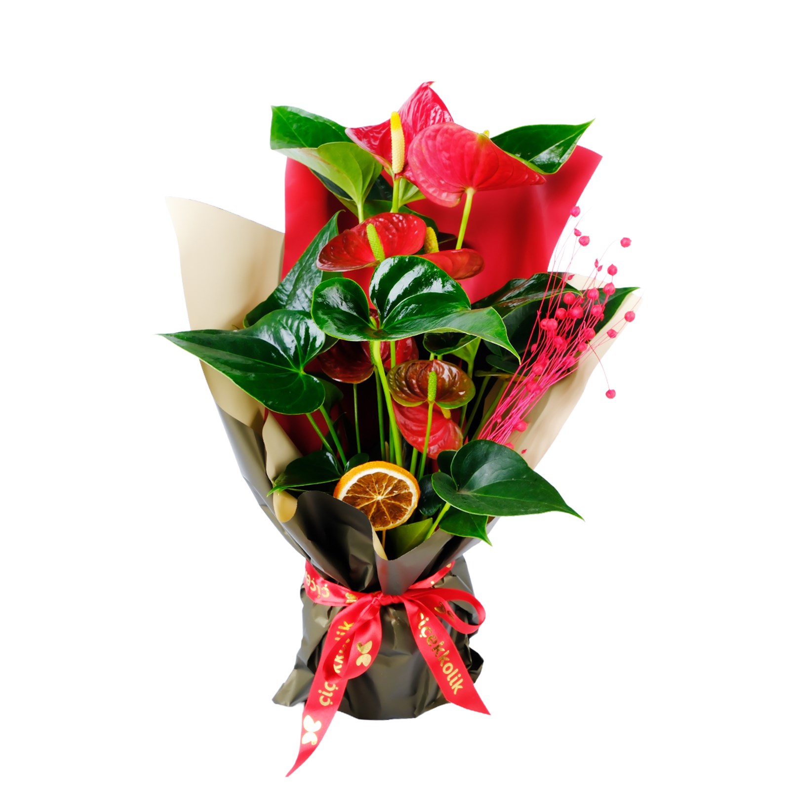 Doğanın en göz alıcı renklerini barındıran Orange Embrace Antoryum, kırmızı antoryum çiçekleriyle tutkulu sevgiyi, büyük yeşil yapraklarıyla doğallığı simgeliyor. Kırmızı ve Yeşil fresh tonlarıyla harmanlanmış bu özel tasarım, sevdiklerinize unutulmaz bir hediye sunmak için mükemmel bir seçenek. Şık ambalajı ve zarif ssülemeleriyle yaşam alanlarına enerji katarken, dekoratif kuru meyve ve aksesuar detaylarıyla fark yaratıyor.