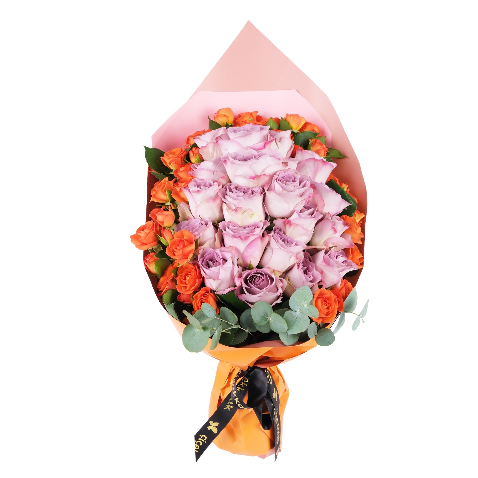 Mini turuncu ve lila güllerin romantizmi, okaliptus yapraklarıyla doğal zarafetini bir araya gertiren Orange & Lilac Rose Bouguet, aşkın en tutkulu halini yansıtıyor. Pembe ve turuncu tasarım ambalajın sofistike kontrastı, çarpıcı bir görsel sunarken okaliptus yaprakları ile eşsiz bir dokunuş kazanılmıştır.
