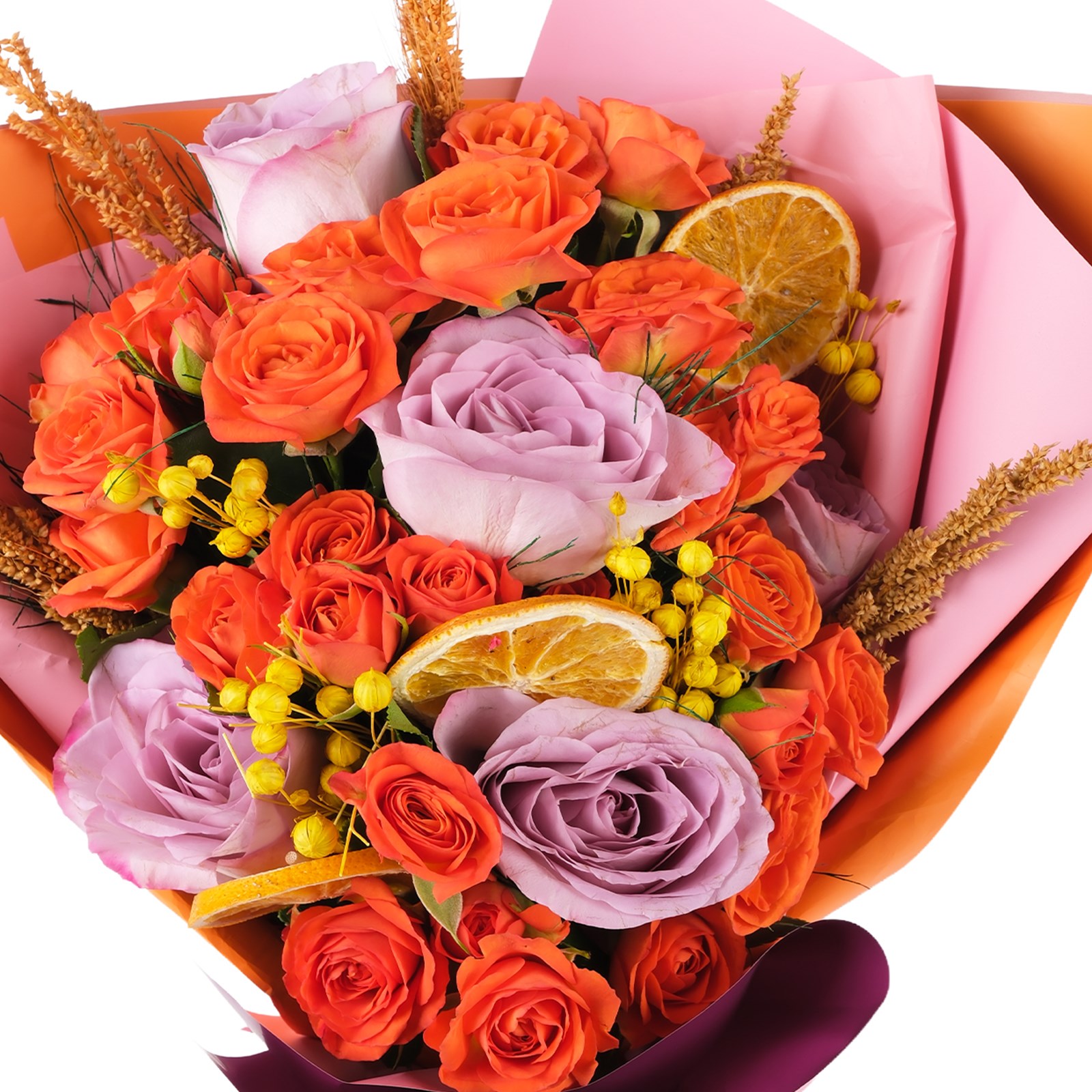 Derin kırmızı güllerin romantizmi Orange & Pink Rose Bouquet, aşkın en tutkulu halini yansıtıyor. Modern tasarım ambalajın sofistike kontrastı, çarpıcı bir görsel sunarken portakal halkalarıyla ve kuru çiçekleriyle eşsiz bir dokunuş kazanılmıştır.