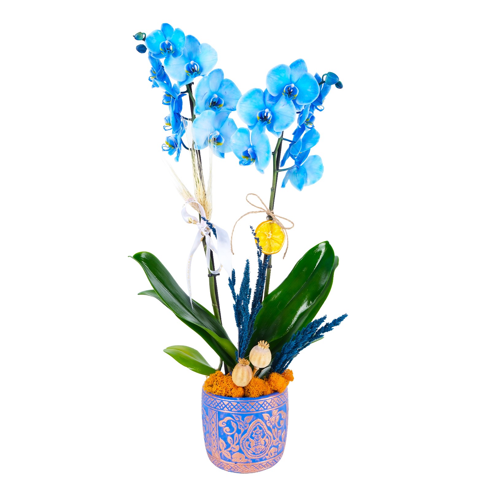 Zarif görünümü ve eşsiz rengiyle Patterned Blue Orchid, yaşam alanlarına modern bir dokunuş kazandırır. Mavi Beton Saksısı ve beyaz kurdele detayıyla hem sofistike hem de dikkat çekici bir tasarım sunar.