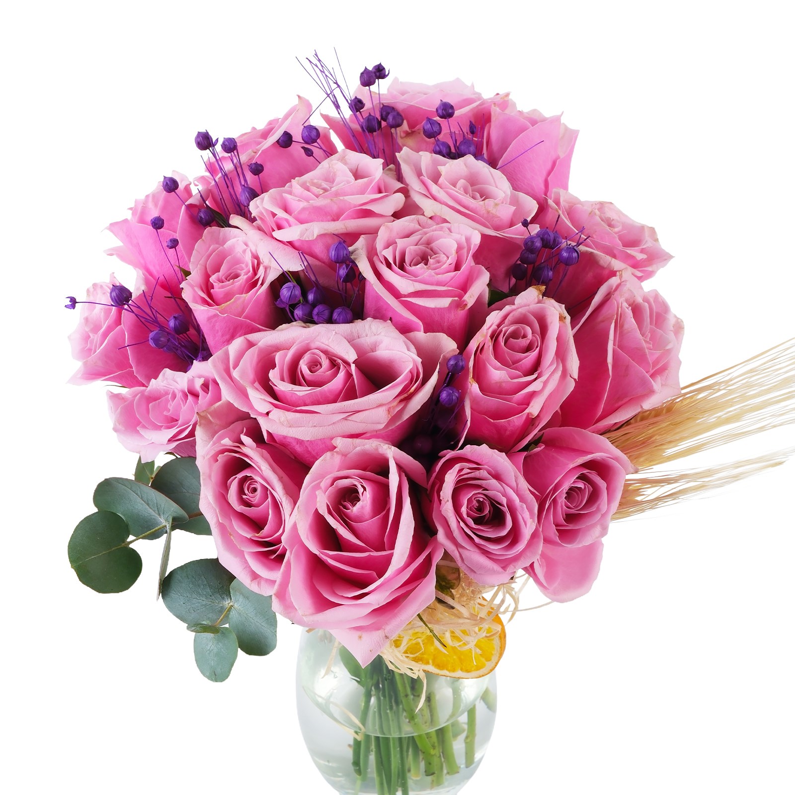 Çiçek Türleri:Pembe güller, okaliptus, kuru çiçekler