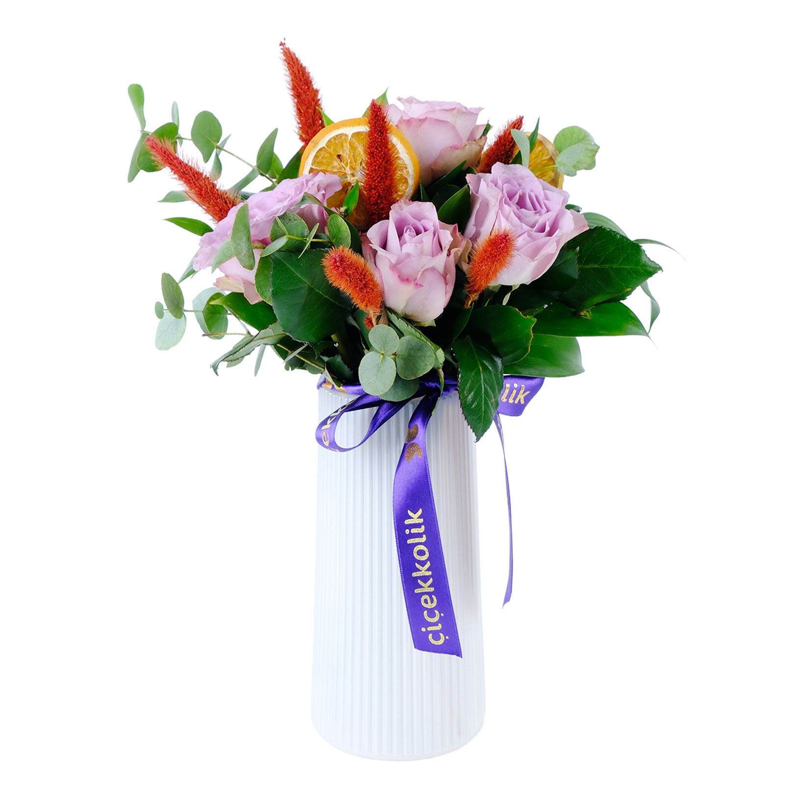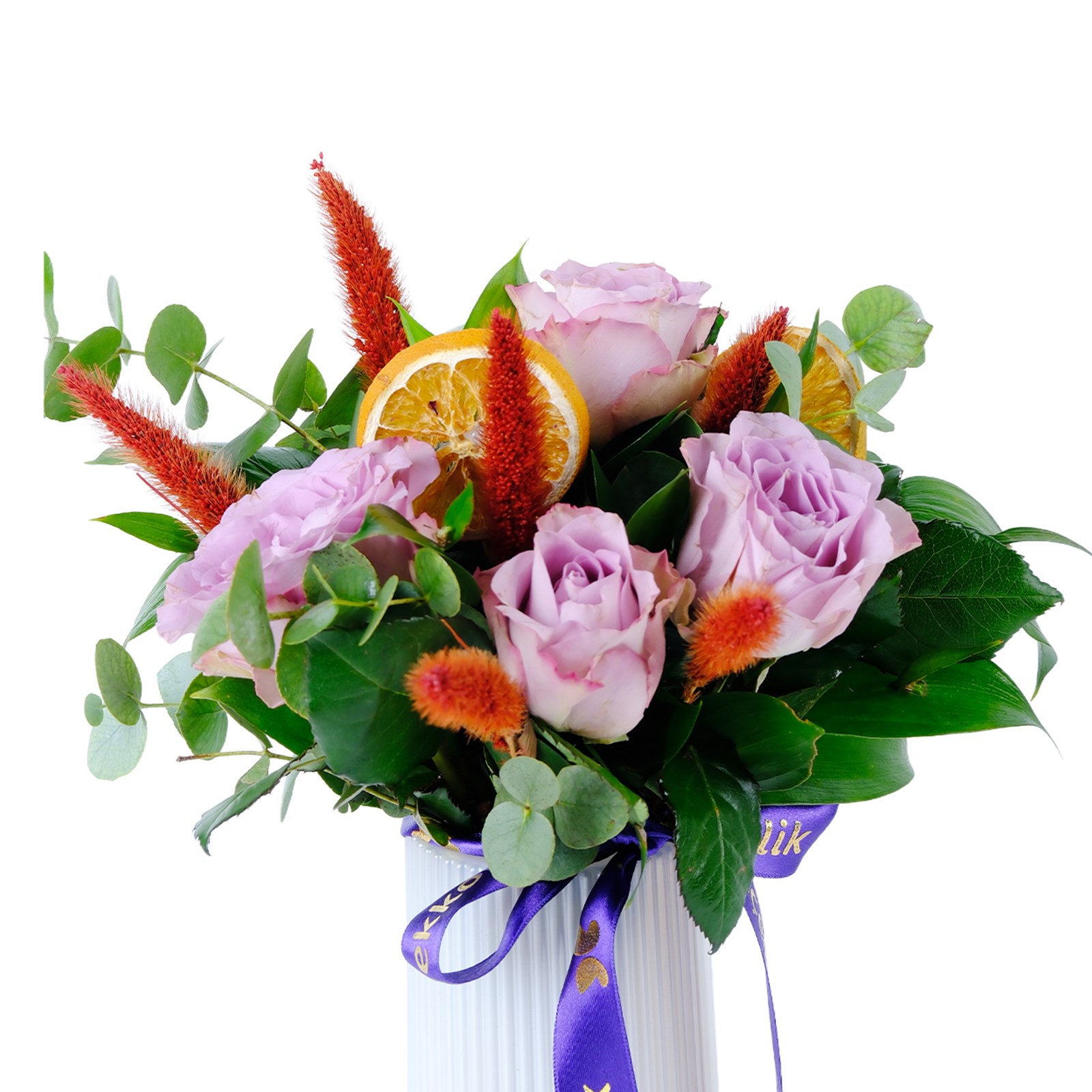 Enerjisi yüksek renklerin buluştuğu Peak lilac 4 lila gül, modern ve ferah bir görünüm sunar. Lila güller, okaliptus dalları ve kuru çiçek dalları zarif bir kompozisyon oluşturur.
