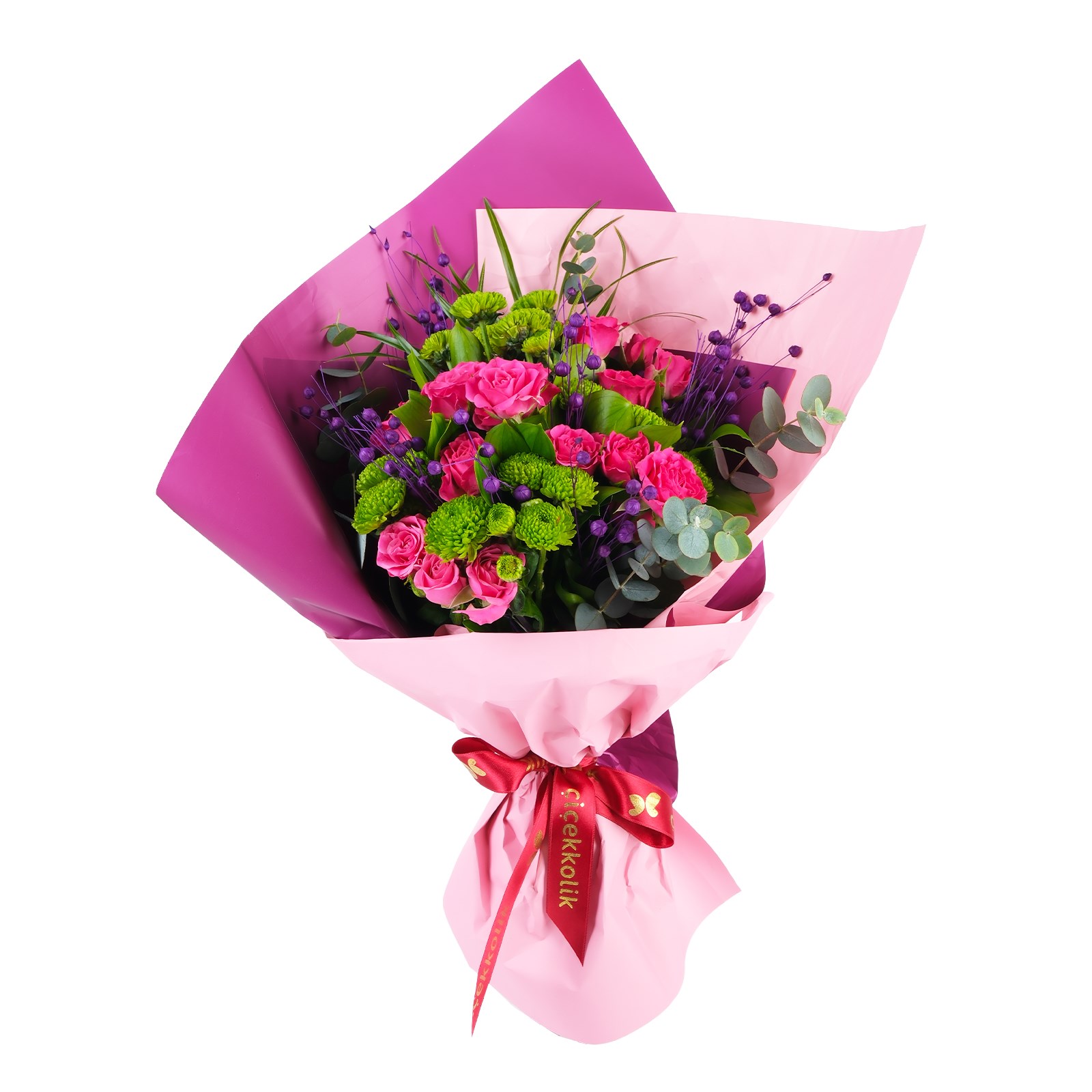 Derin pembe güllerin romantizmi Pink & Çardak Gül Buketi, aşkın en tutkulu halini yansıtıyor. Modern tasarım ambalajın sofistike kontrastı, çarpıcı bir görsel sunarken okaliptus yaprakları,yeşil biçmeler ve kuru çiçekleriyle eşsiz bir dokunuş kazanılmıştır.