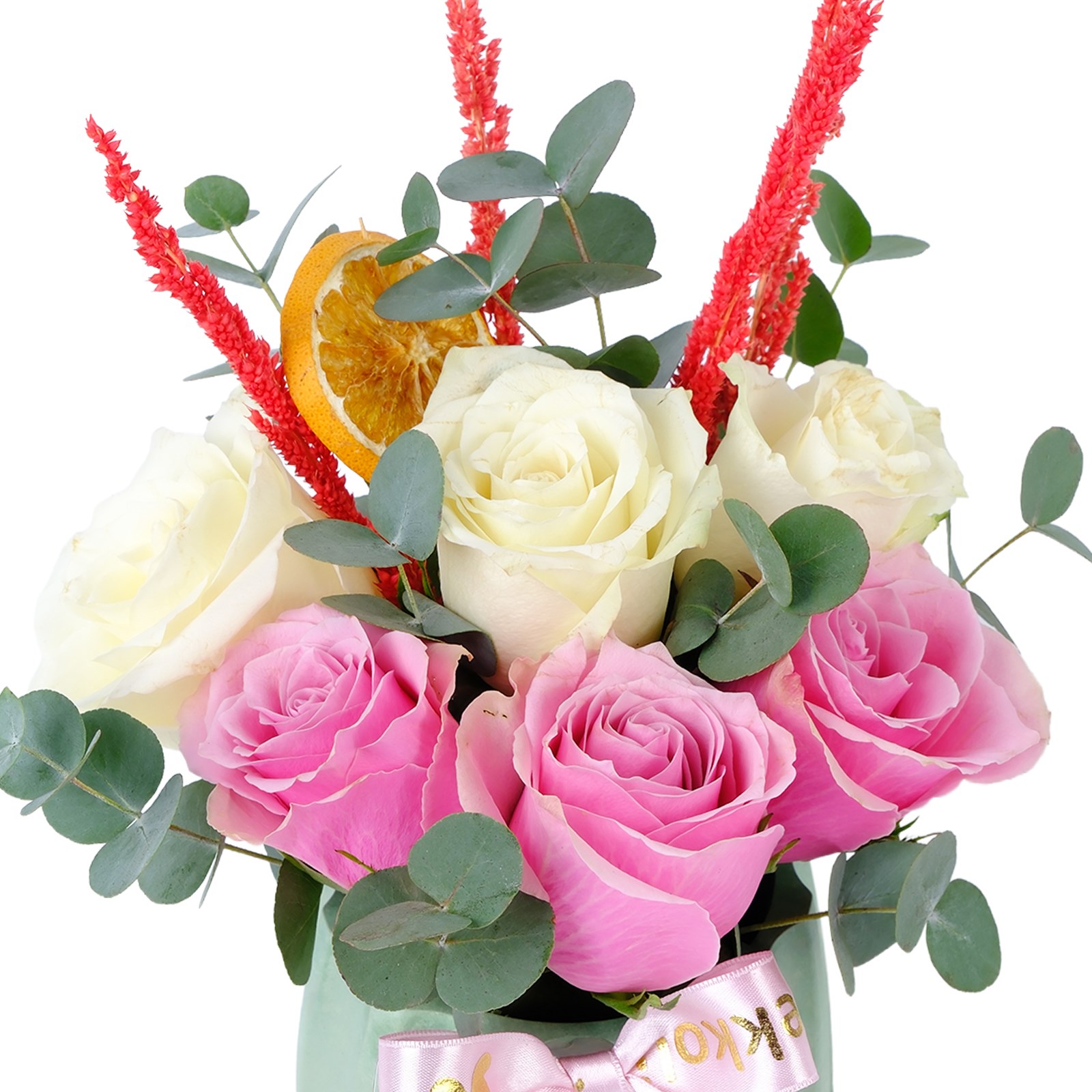Ürün İçeriği:Pembe güller, beyaz güller, kurutulmuş portakal dilimi,okaliptus