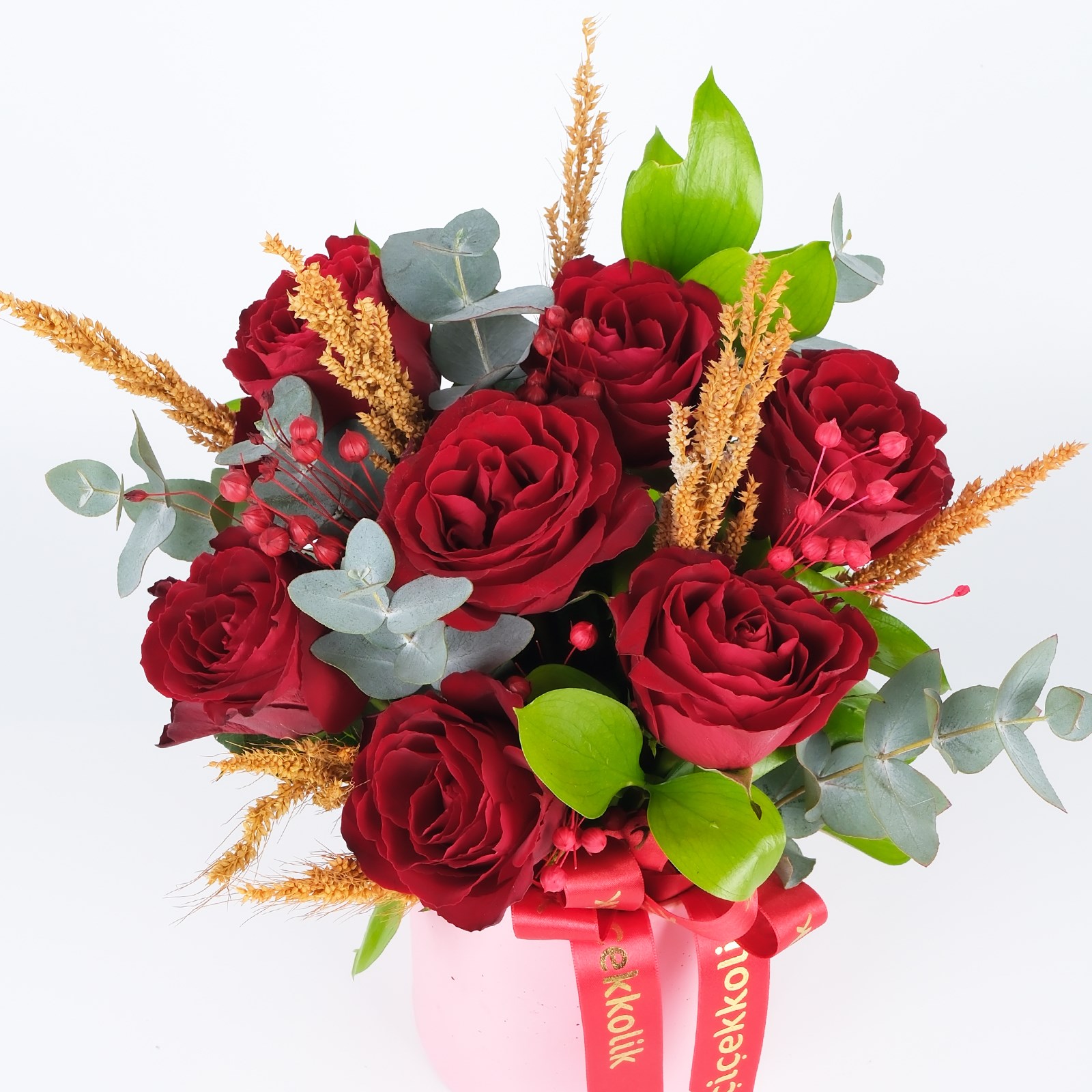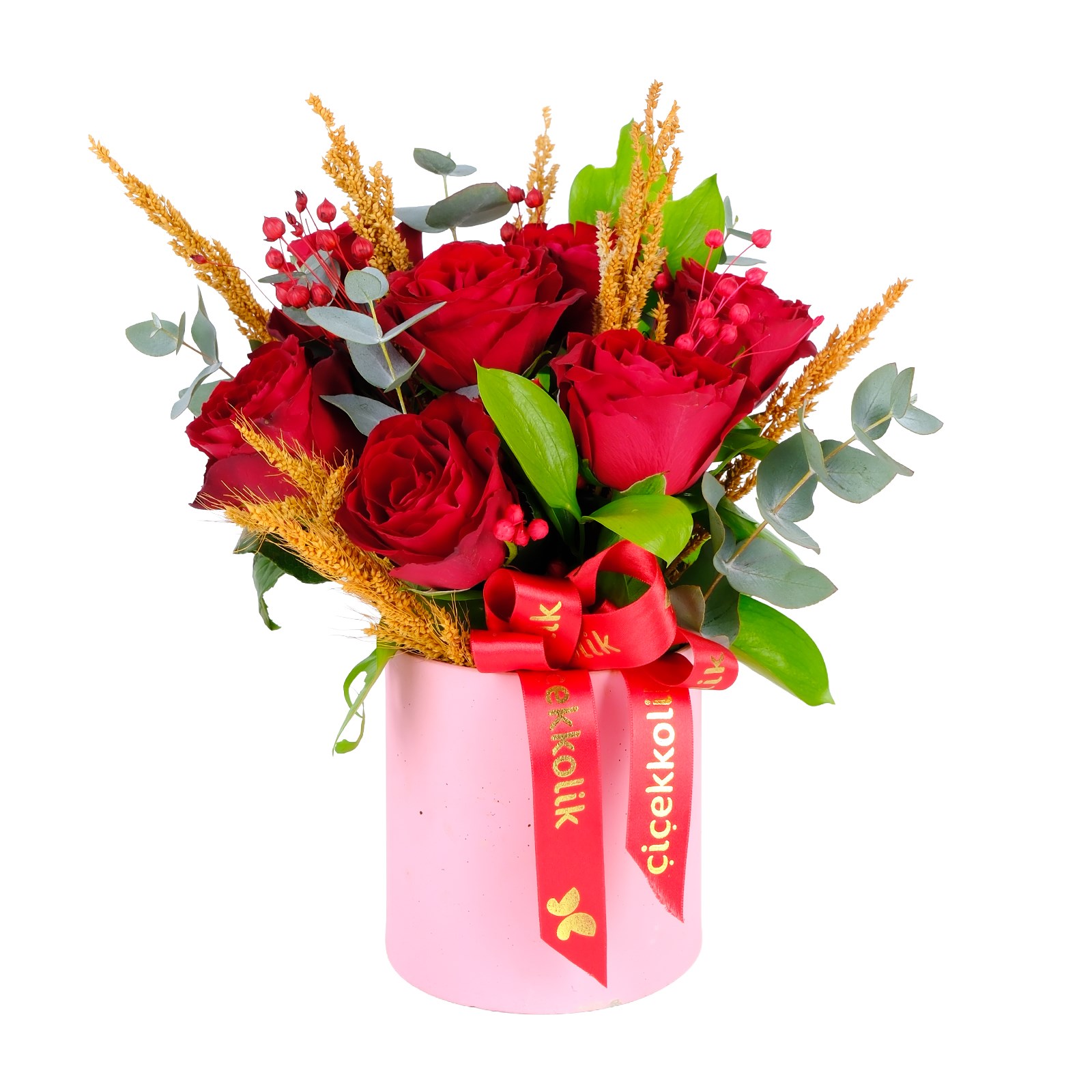 Enerjisi yüksek renklerin buluştuğu Pink Flame Kırmızı Güller, modern ve ferah bir görünüm sunar. Kırmızı ve kuru çiçek dalları zarif bir kompozisyon oluşturur.